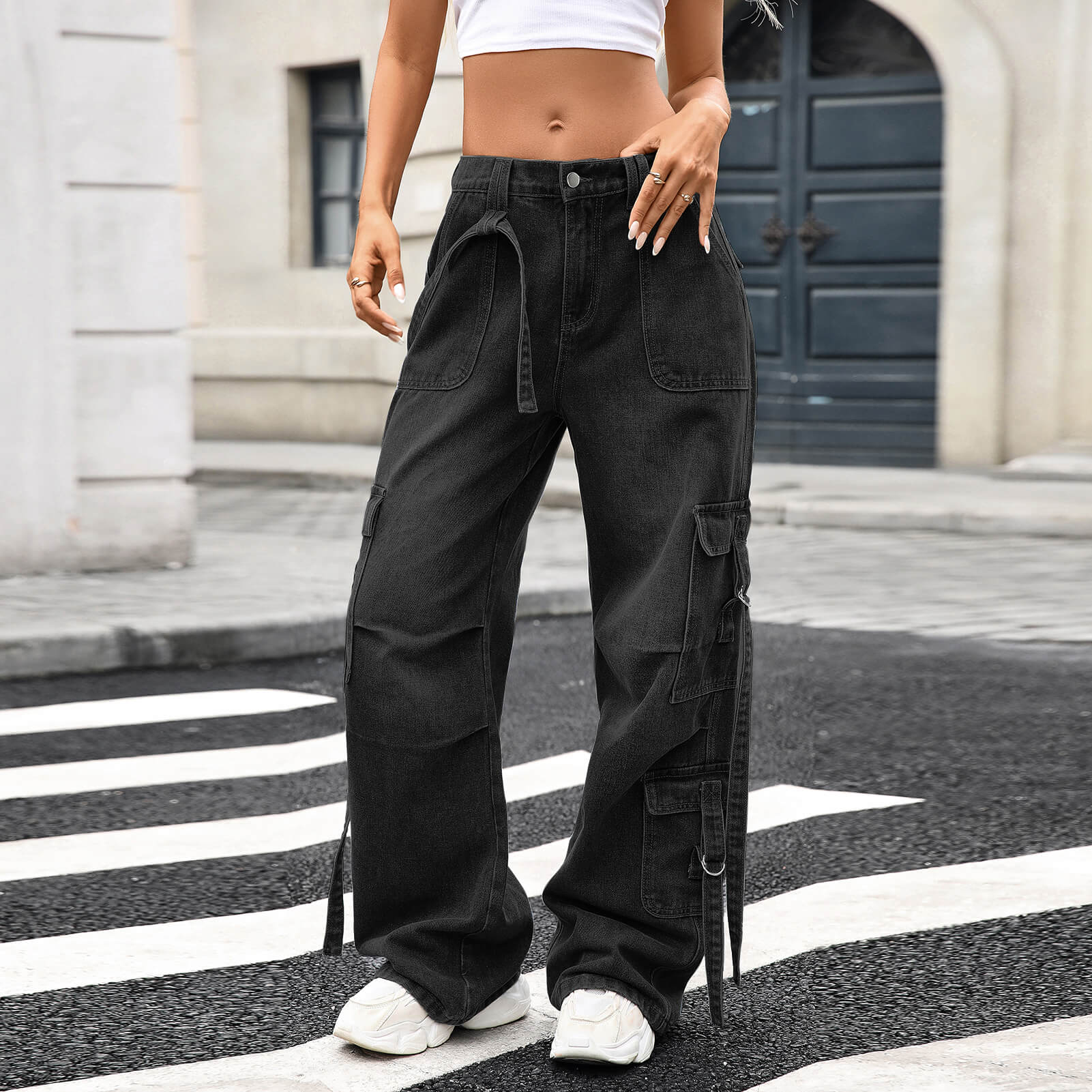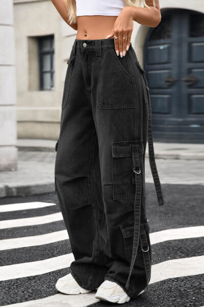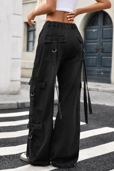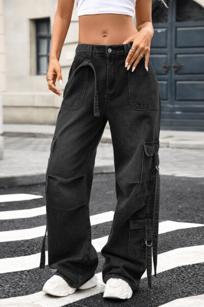 Black Washed Utility Wide-Leg Denim Pants with Tie Accents