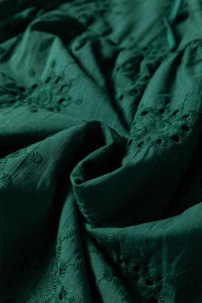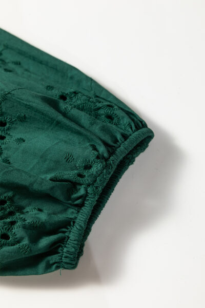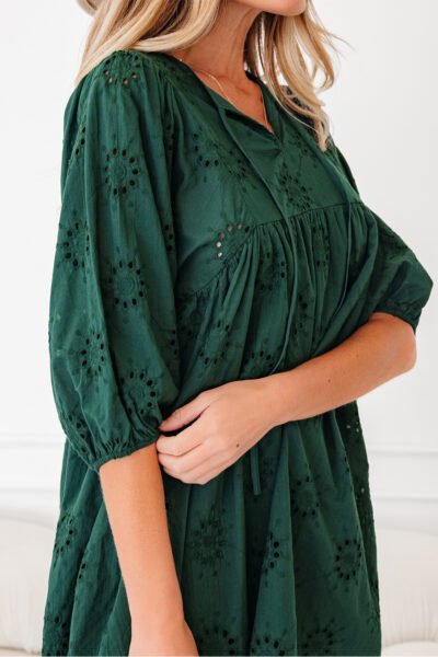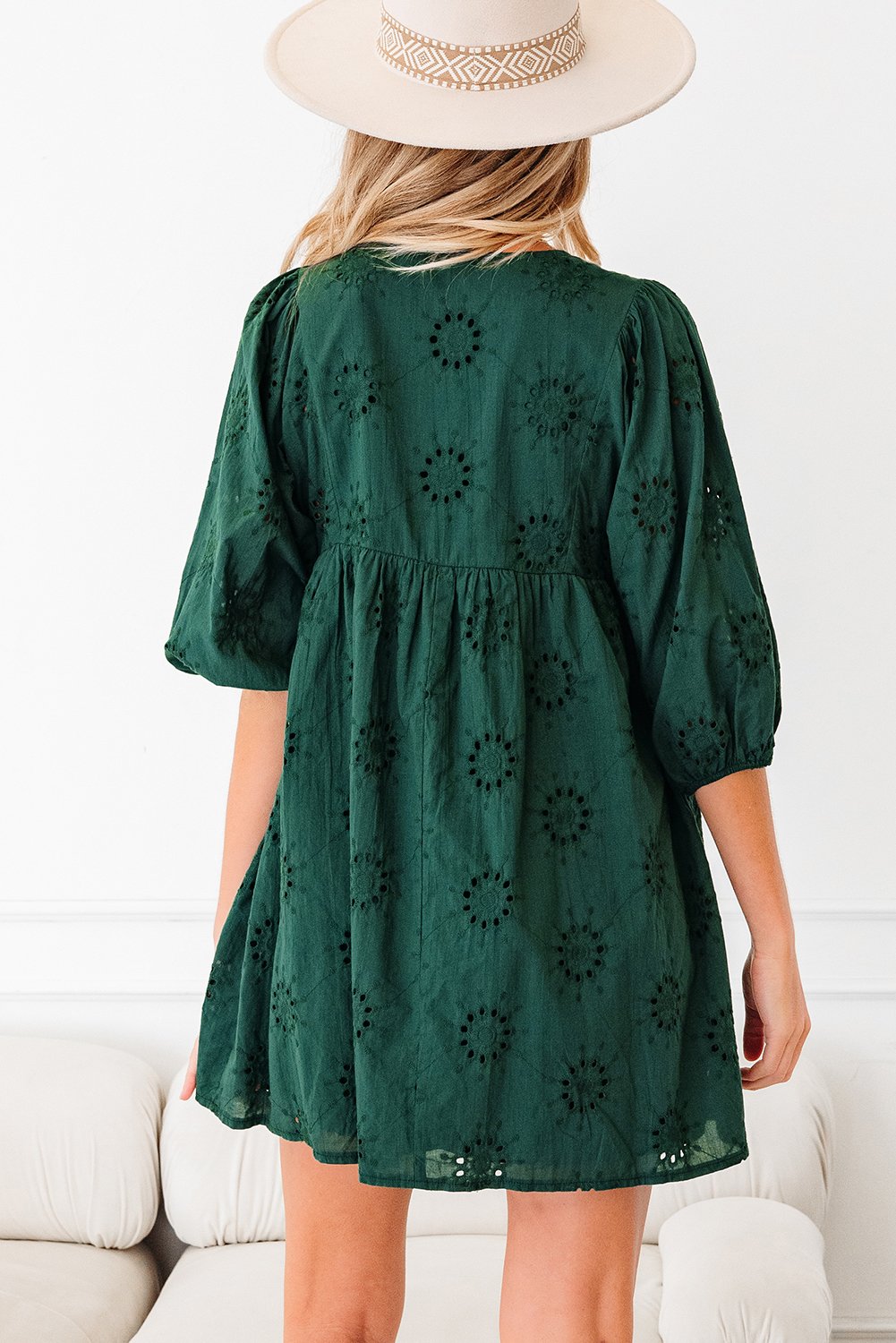 Blackish Green Embroidered Eyelet Pattern 3/4 Puffy Sleeve Swing Mini Dress