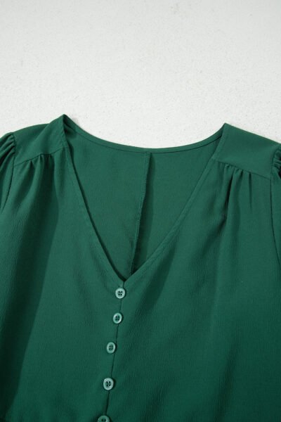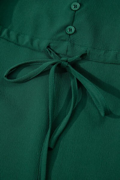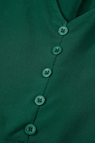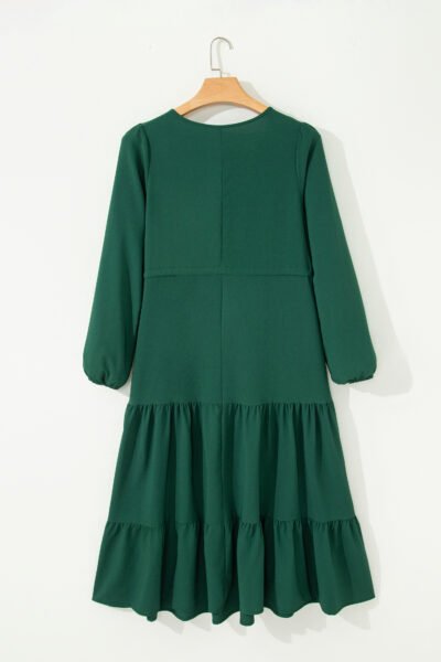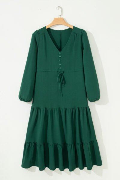 Blackish Green Solid Long Sleeve Button V Neck Tiered Maxi Dress