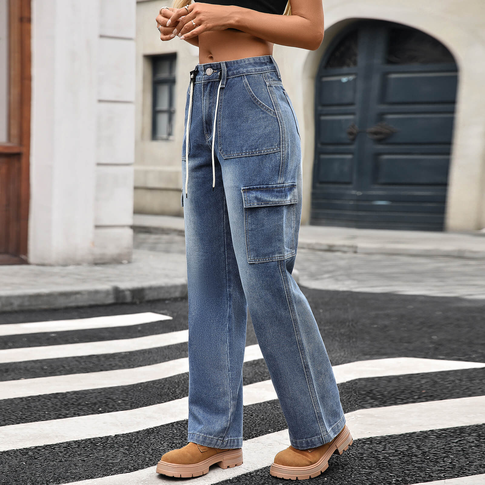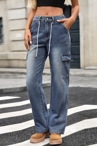 Blue Casual Straight Leg Multi Pocket Denim Cargo Pants