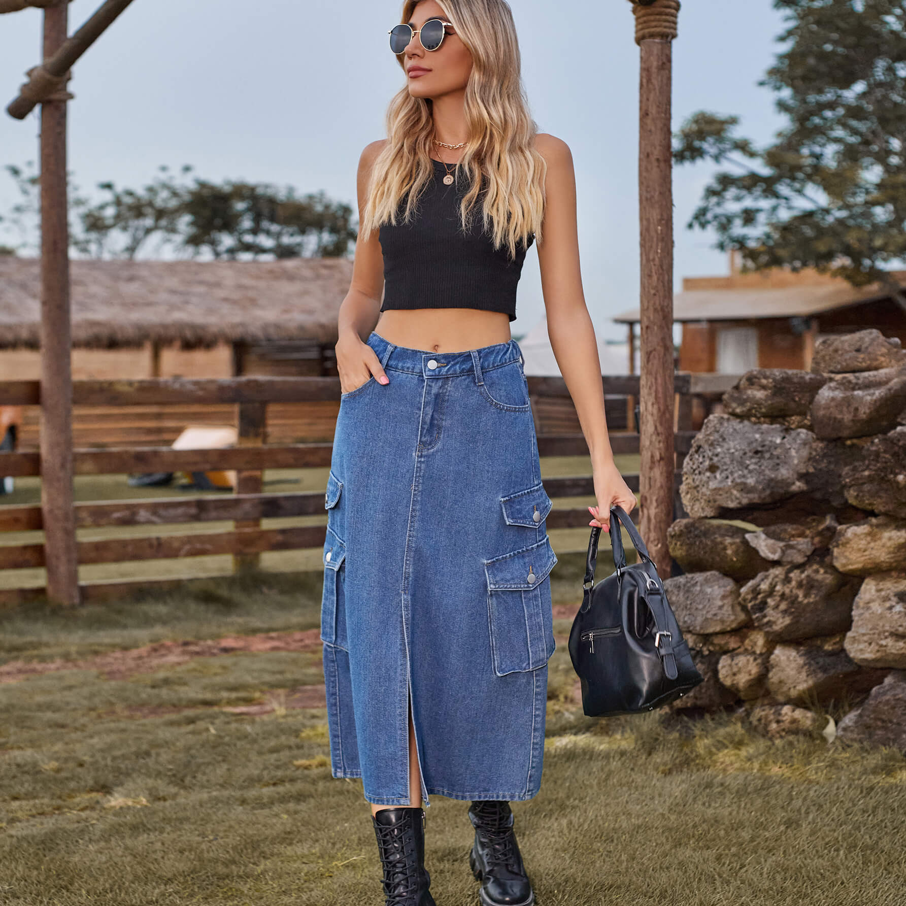 Blue Color Casual Denim Cargo Midi Skirt with Dual Side Pockets