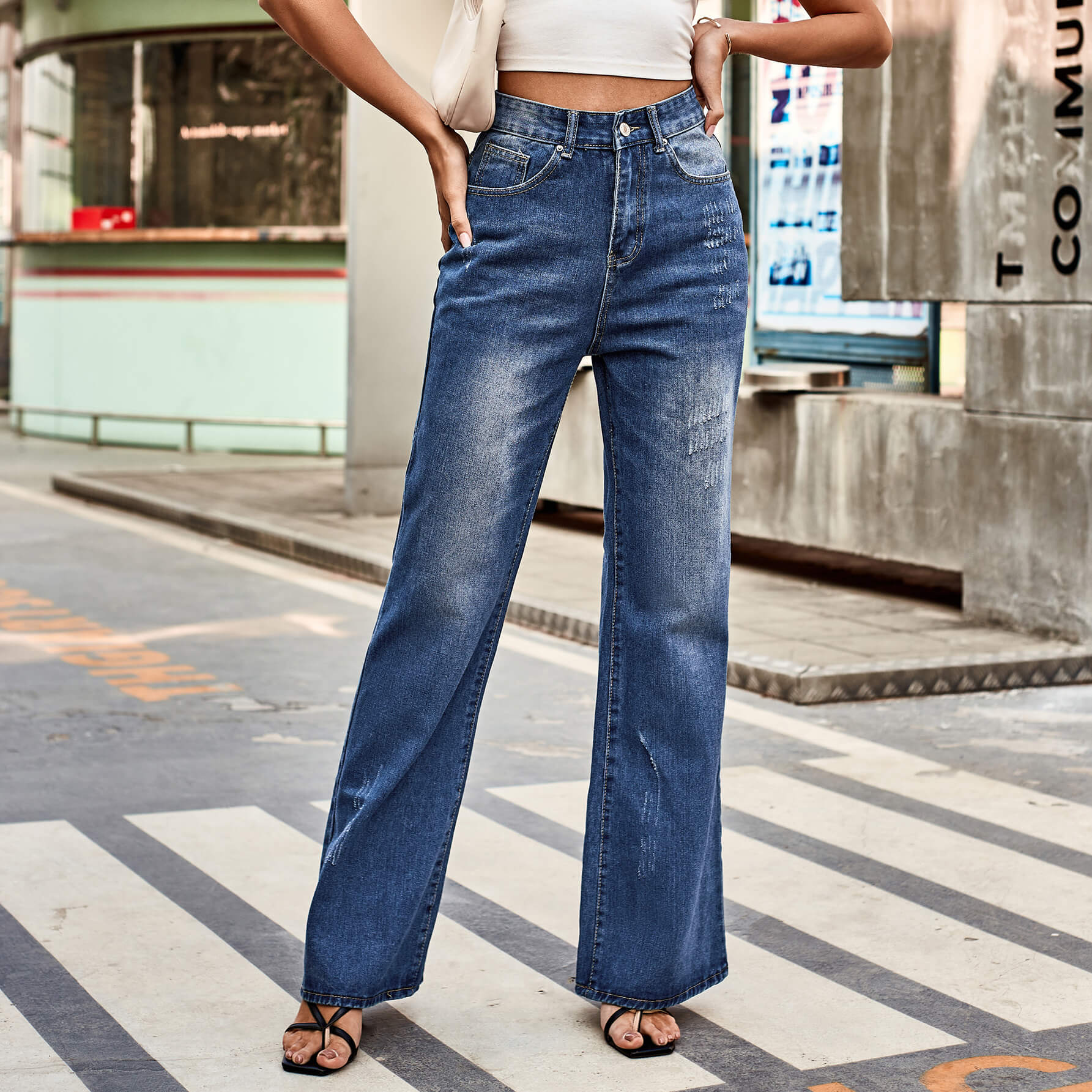 Blue Color Casual Washed Mid-Waist Slightly Flared Denim Pants