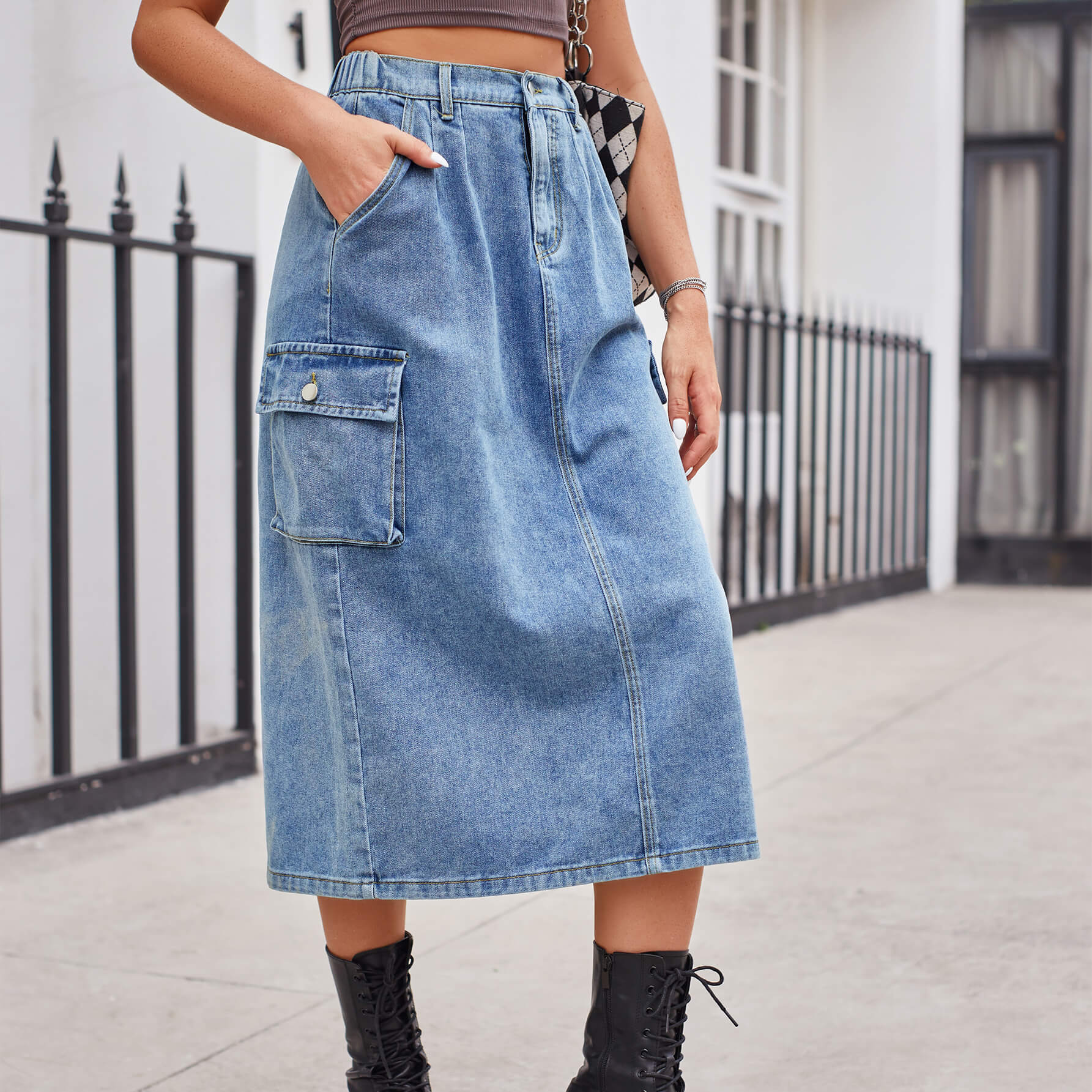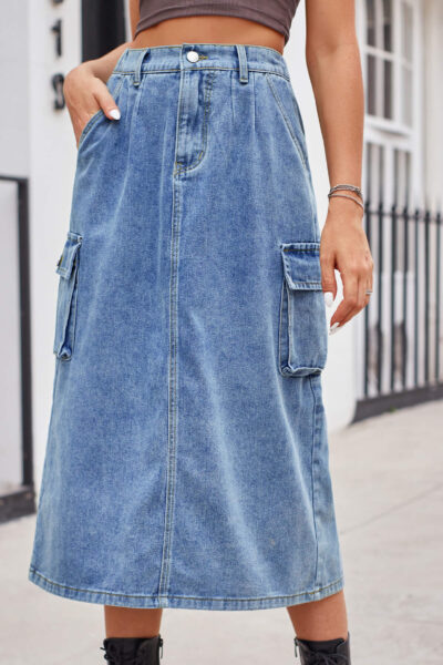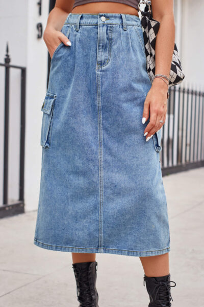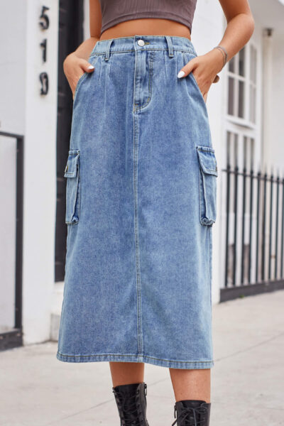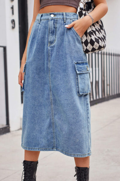 Blue Color Casual Washed Denim Cargo Midi Skirt with Back Slit