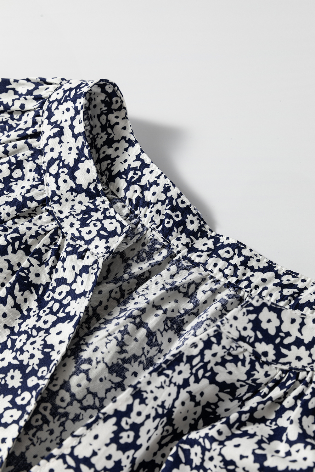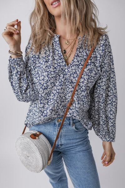 Blue Floral Print Notched V Neck Puff Sleeve Blouse