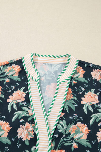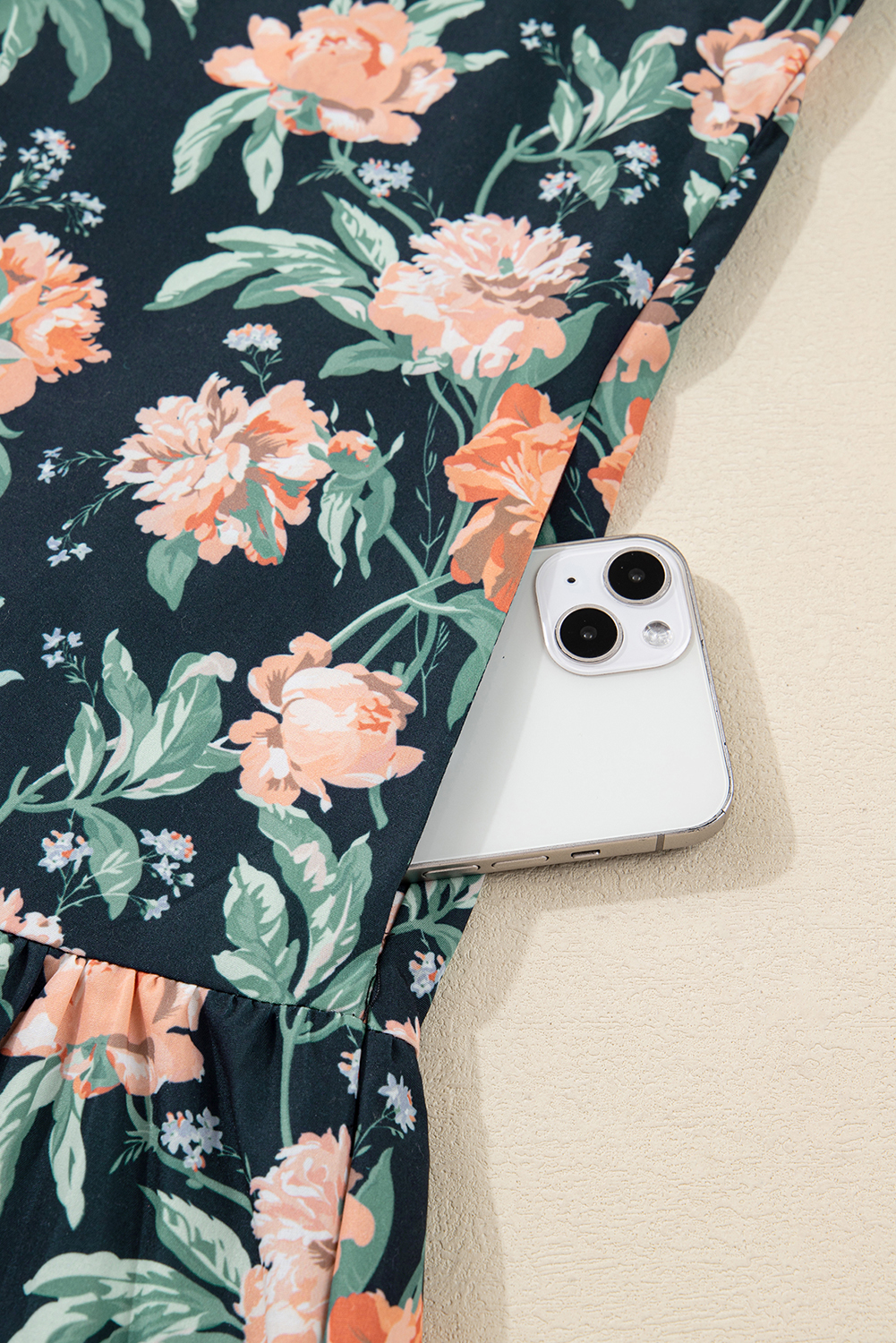 Blue Floral Print Striped Trim V Neck Long Sleeve Ruffle Hem Shift Mini Dress