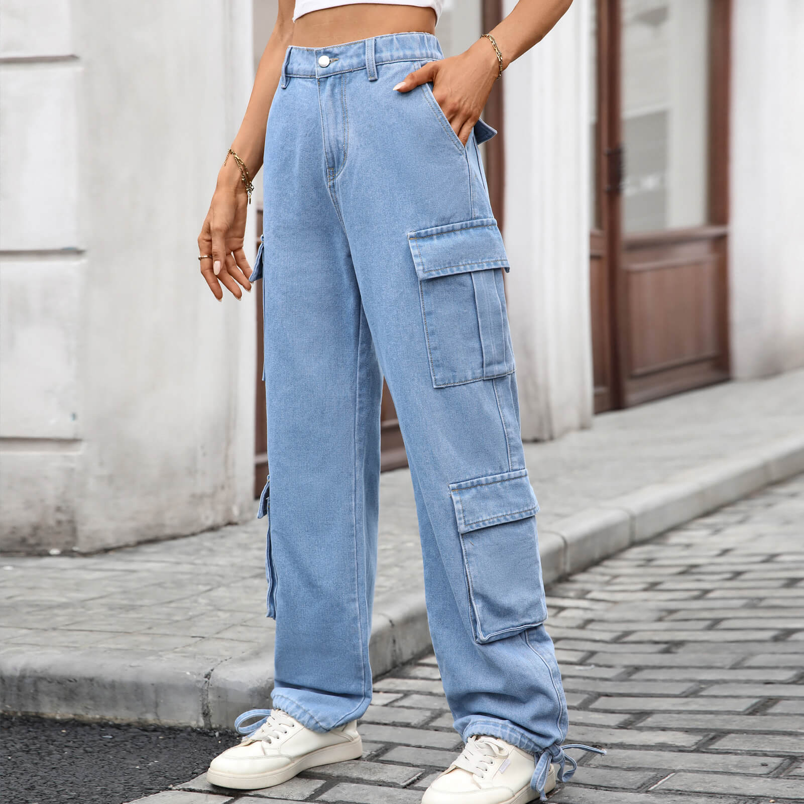 Blue Loose Fit Drawstring Hem Denim Cargo Pants