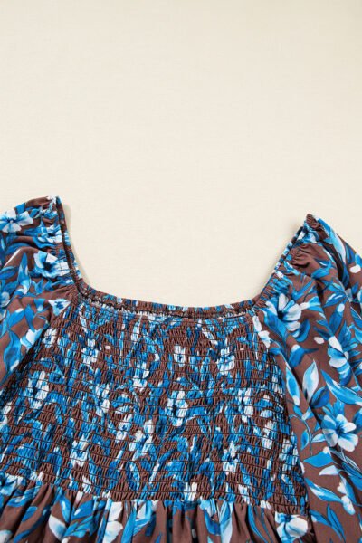 Blue Smocked Bodice High Waist Ruffled Sleeve Floral Dress