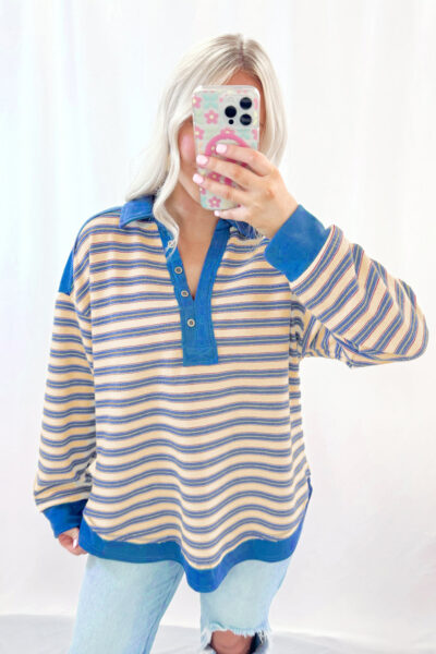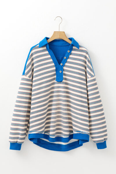 Blue Stripe Buttoned V Neck Collared Drop Shoulder Top