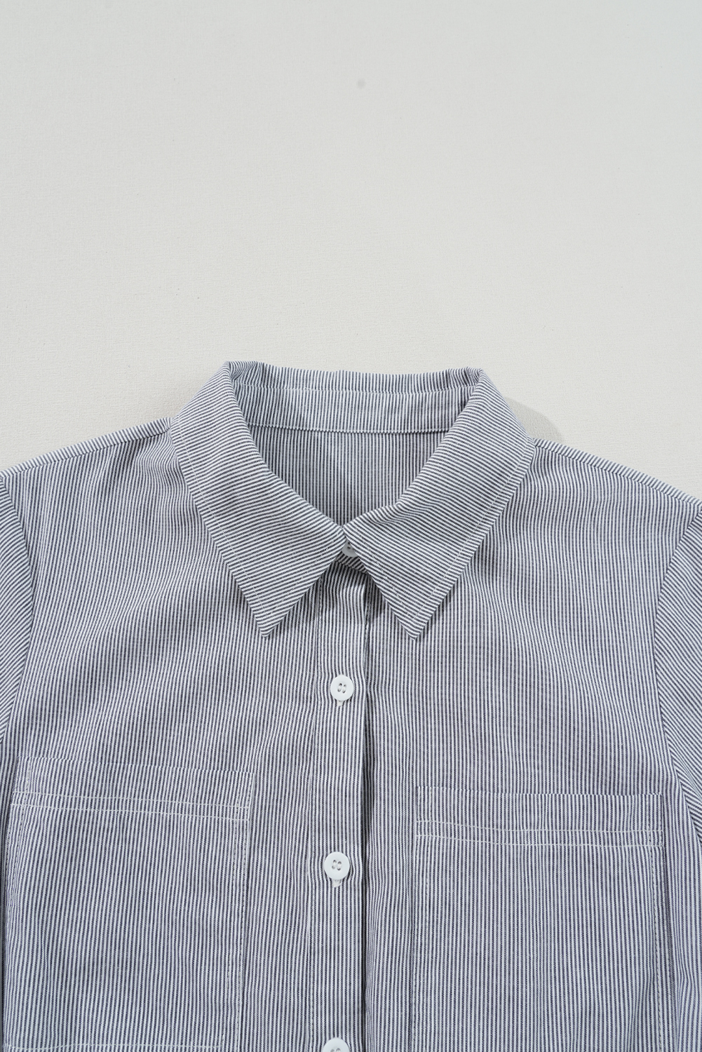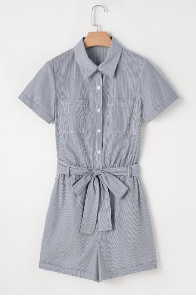 Blue Stripe Chest Pockets Buttoned Belted High Waist Romper