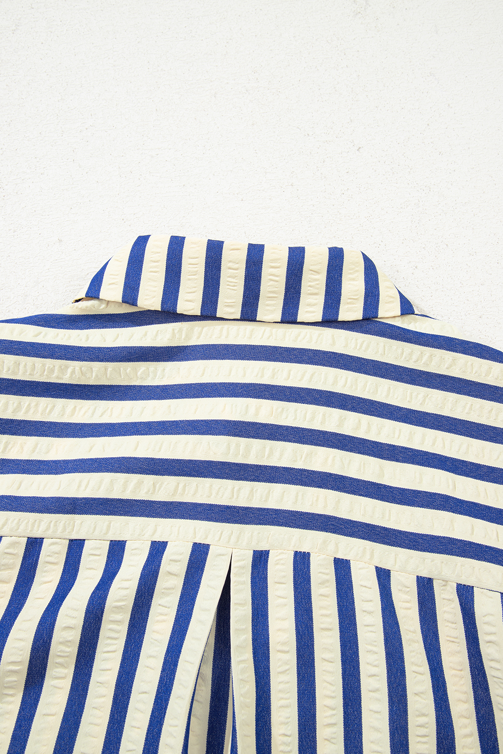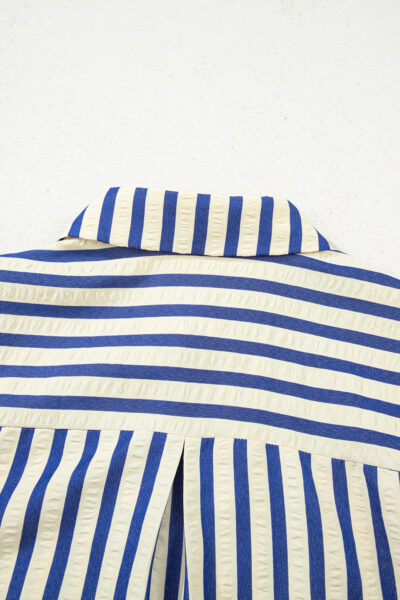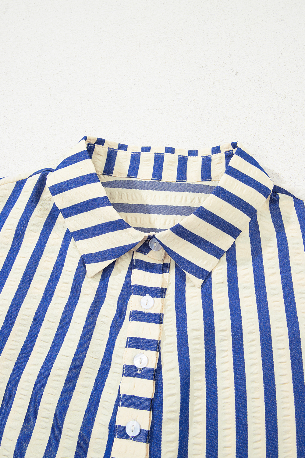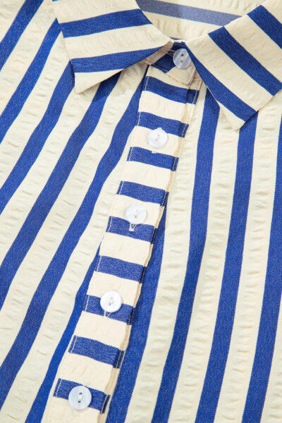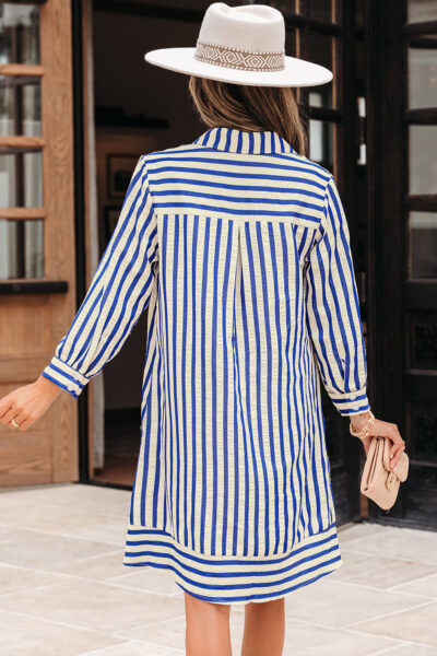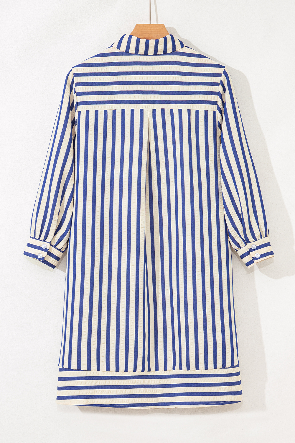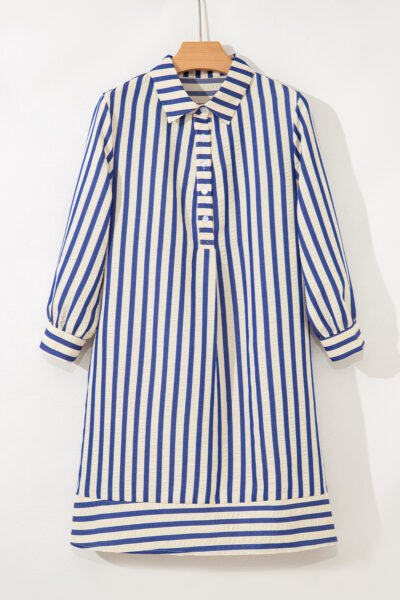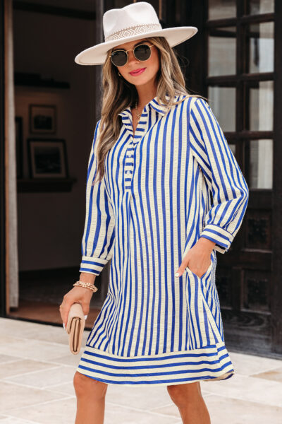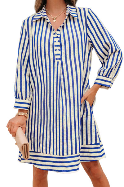 Blue Stripe Collared Half Button Side Pockets Loose Fit Mini Dress