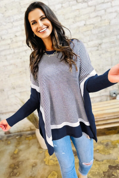 Blue Stripe Color Block Patchwork Dolman Oversize Tunic Sweater