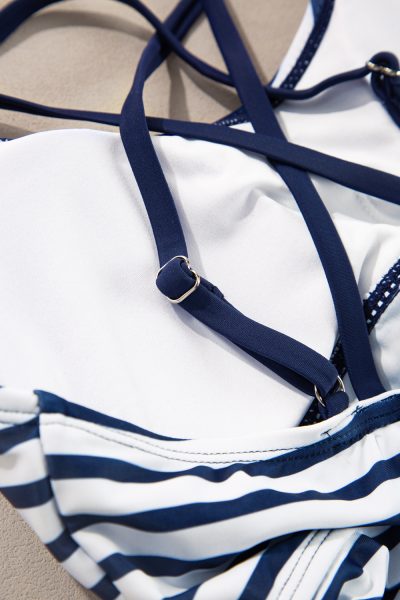 Blue Stripe Drawstring Tummy Control Mix-and-match 2pcs Tankini Swimsuit