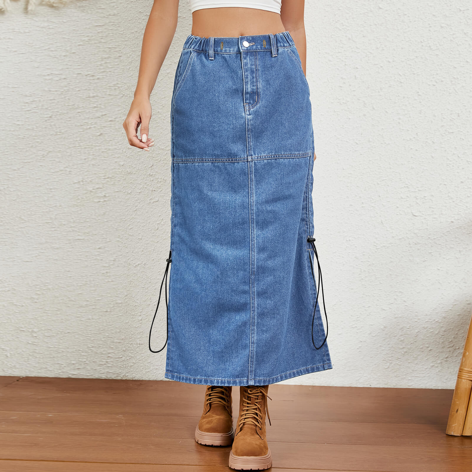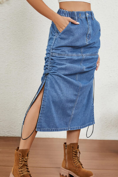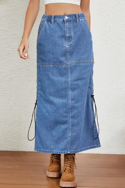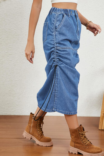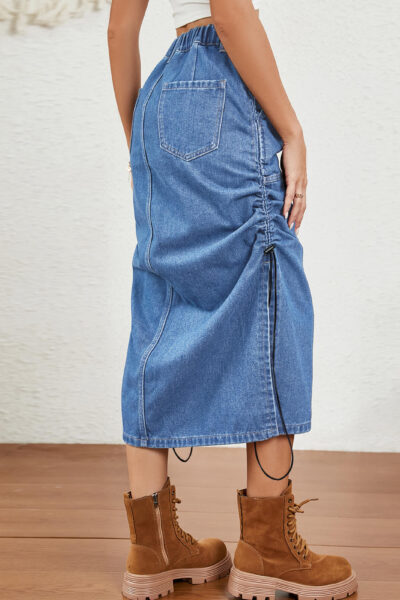 Blue Washed Elastic Waist Denim Midi Skirt with Side Slits and Drawstring