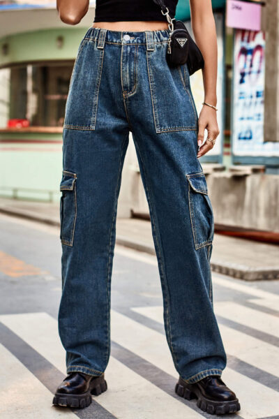 Blue Washed Semi-Elastic Waist Denim Cargo Casual Pants