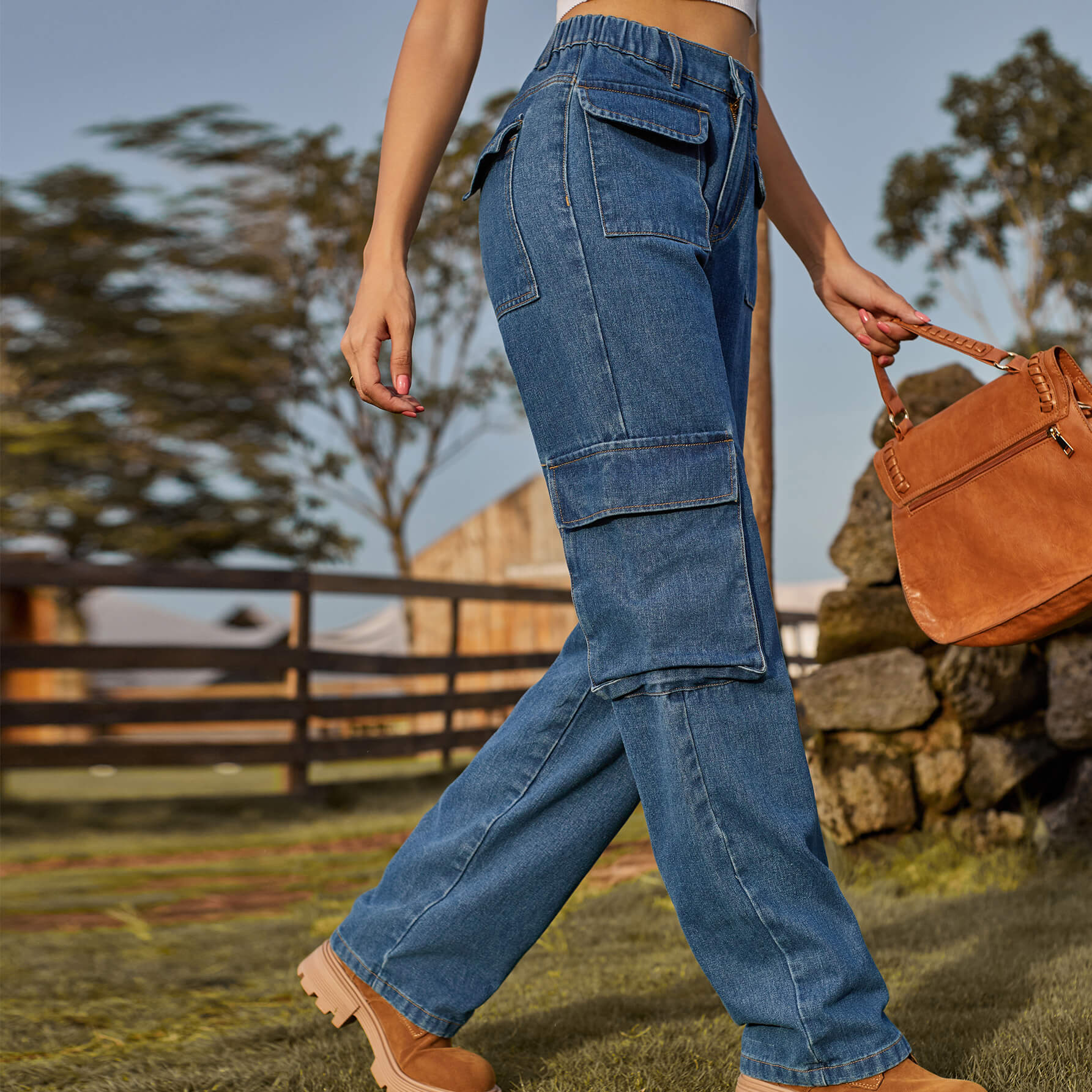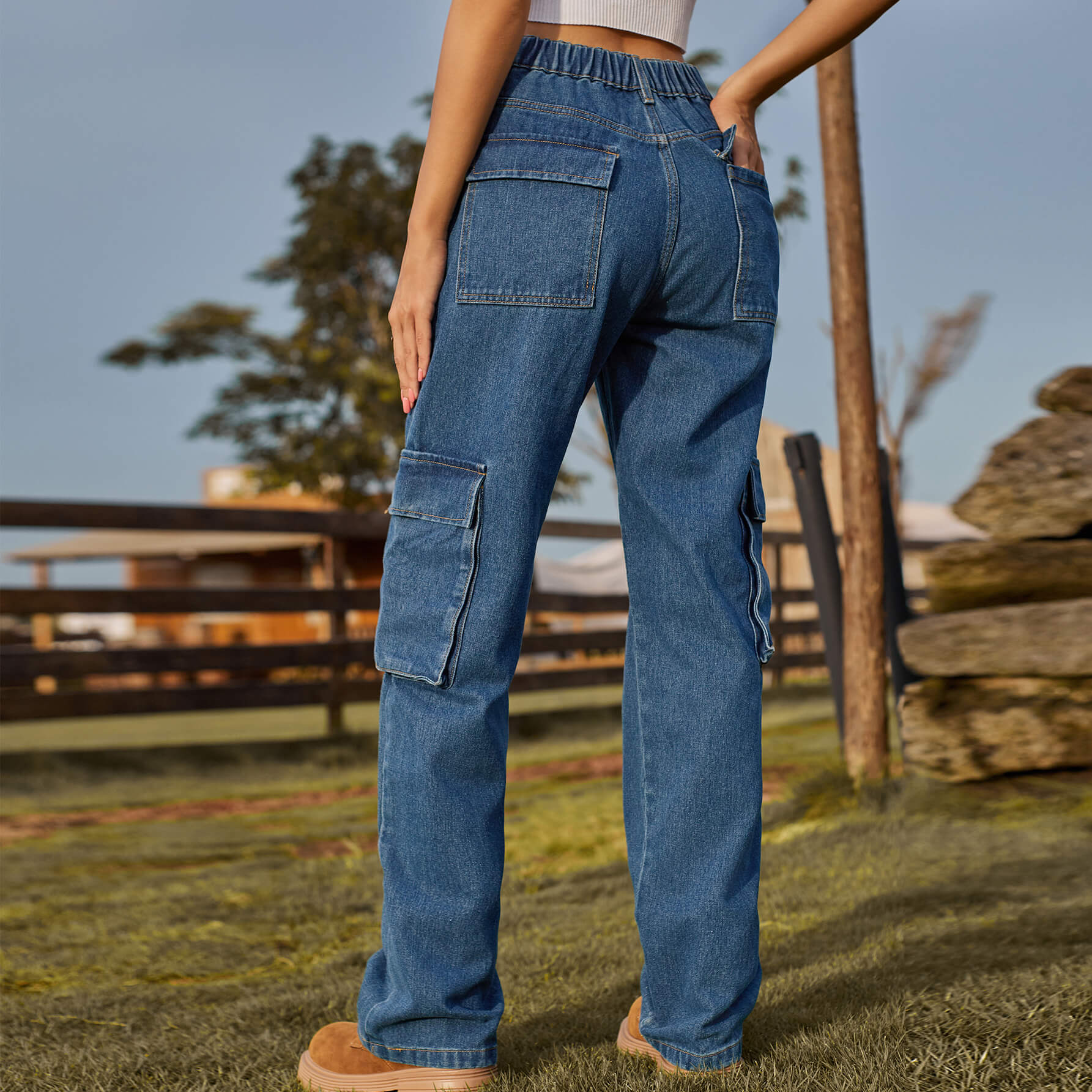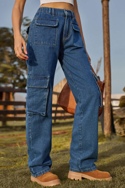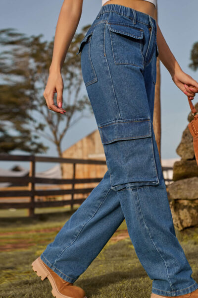 Blue Washed Semi Elastic Waist Multi Flap Pocket Denim Cargo Pants