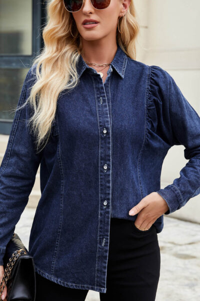 Blue Washed Structured Shoulder Long Sleeve Denim Shirt Top