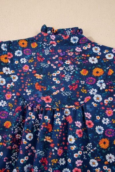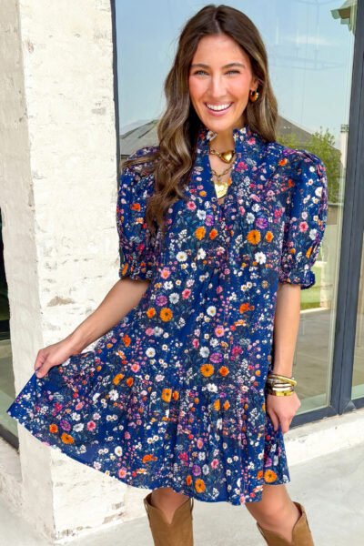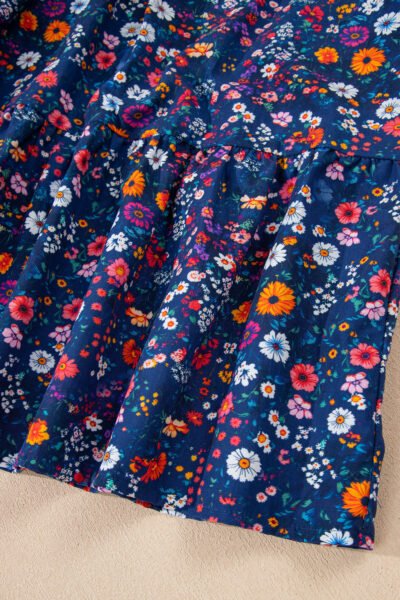 Blue Wild Daisy Floral Split Neck Short Puff Sleeve Mini Dress