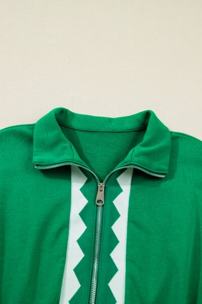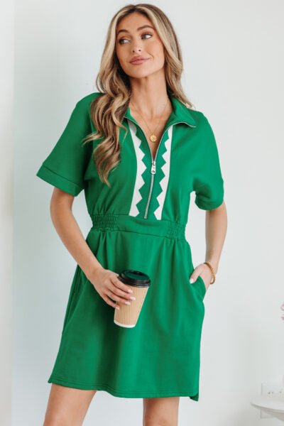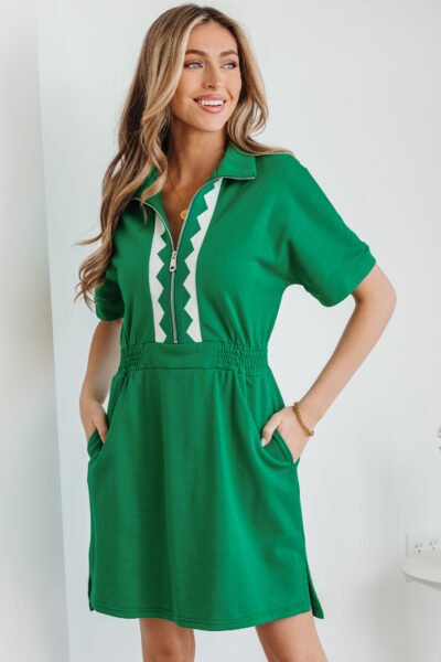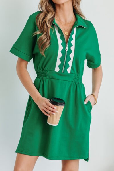 Bright Green Contrast Patchwork Half Zip Elastic Waist Short Sleeve Mini Dress