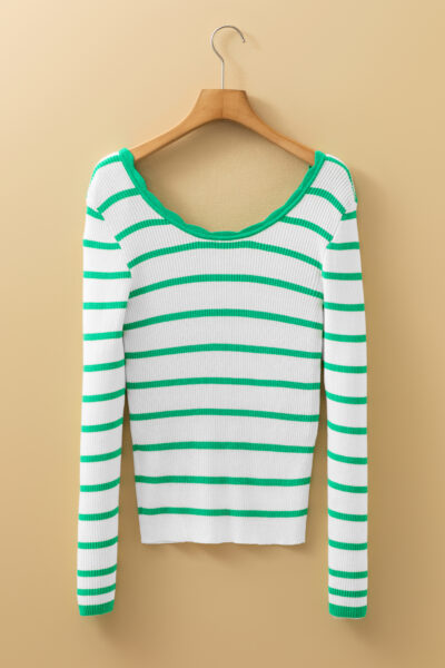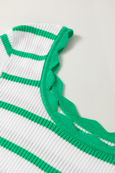 Bright Green Scalloped Trim U Neck Striped Ribbed Slim Sweater