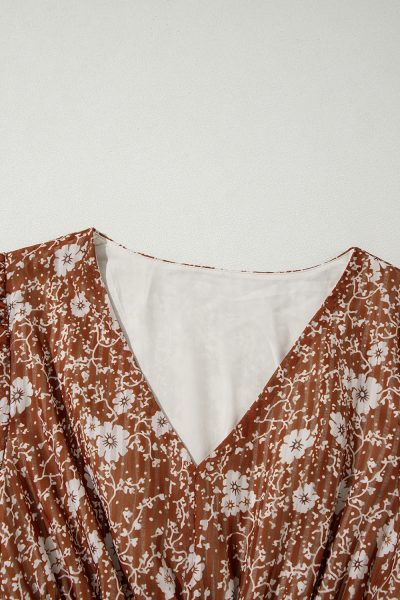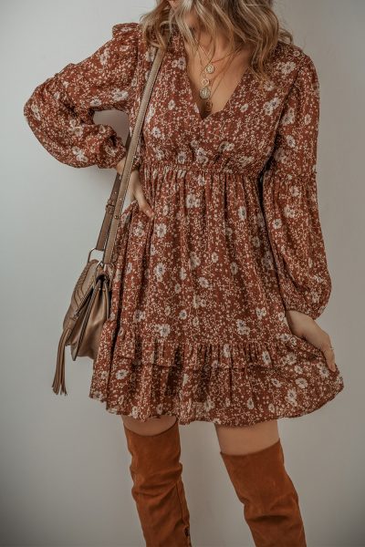 Brown Boho Floral Ruffled Puff Sleeve V Neck Mini Dress
