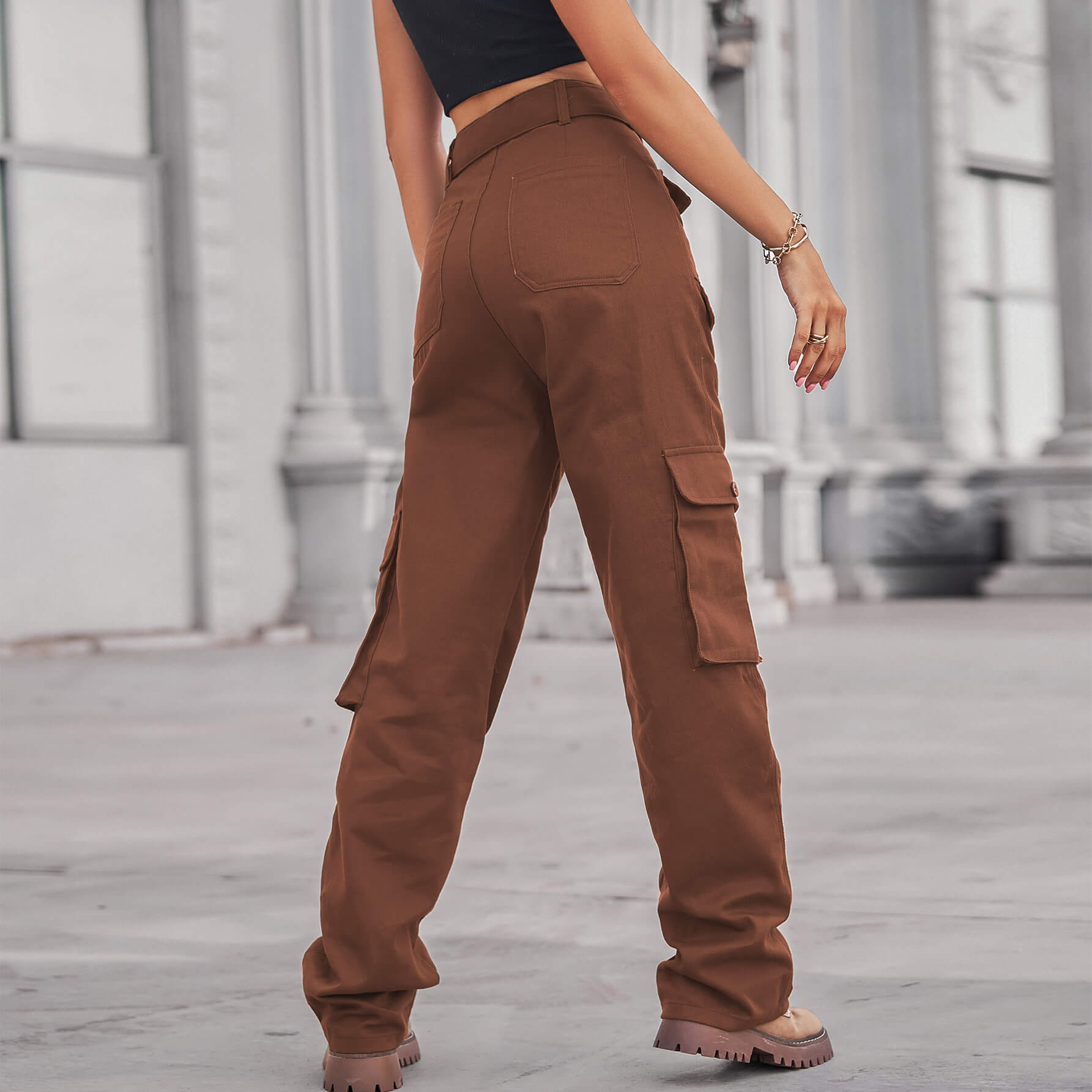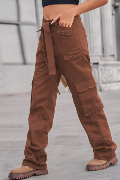 Brown Color Denim Multi Pocket Cargo Pants with Long Belt