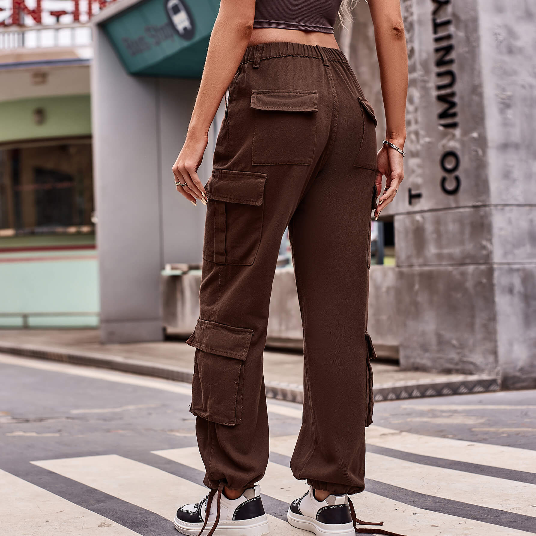Brown Color Loose Fit Drawstring Hem Denim Cargo Pants