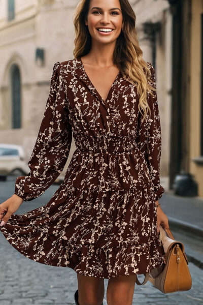 Brown Ditsy Floral Print Split Neck Long Sleeve Shirred Waist Flared Mini Dress