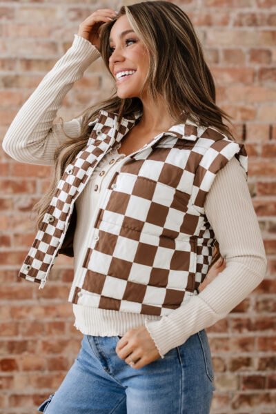 Brown Double Checked Stand Collar Cropped Puffer Vest