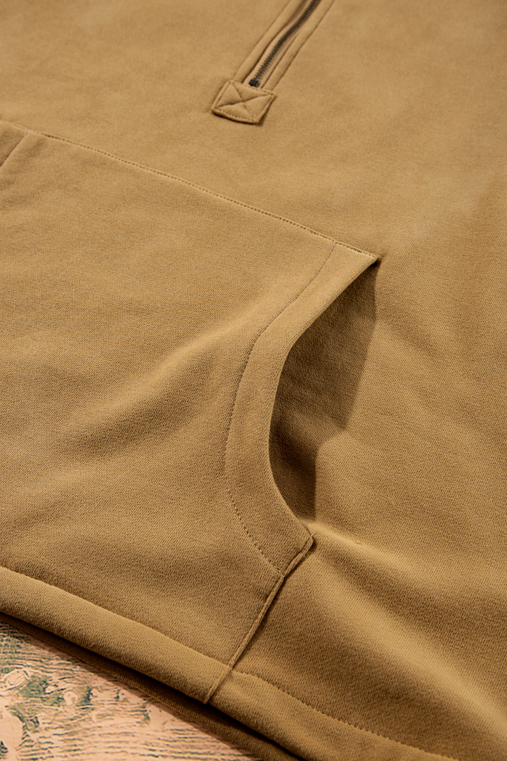 Brown Fleece Lined Half Zipper Kangaroo Pockets Loose Hoodie