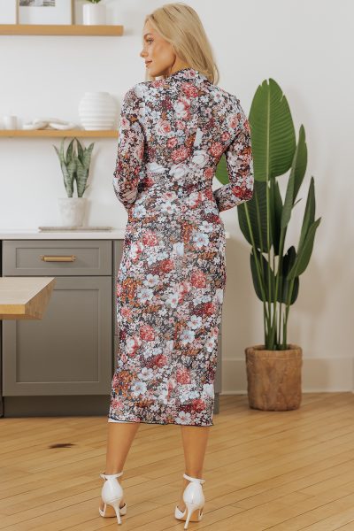 Brown Floral Allover Print Mock Neck Bodycon Long Sleeve Midi Dress