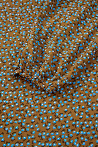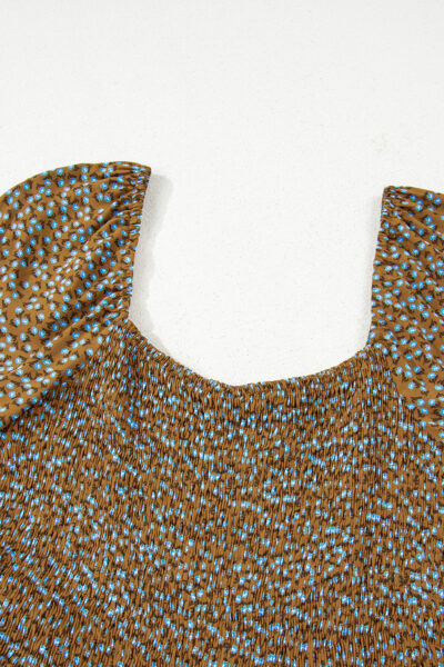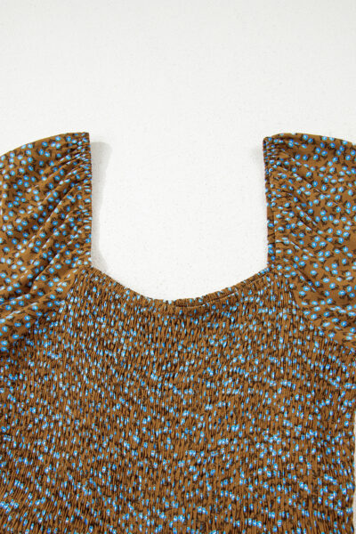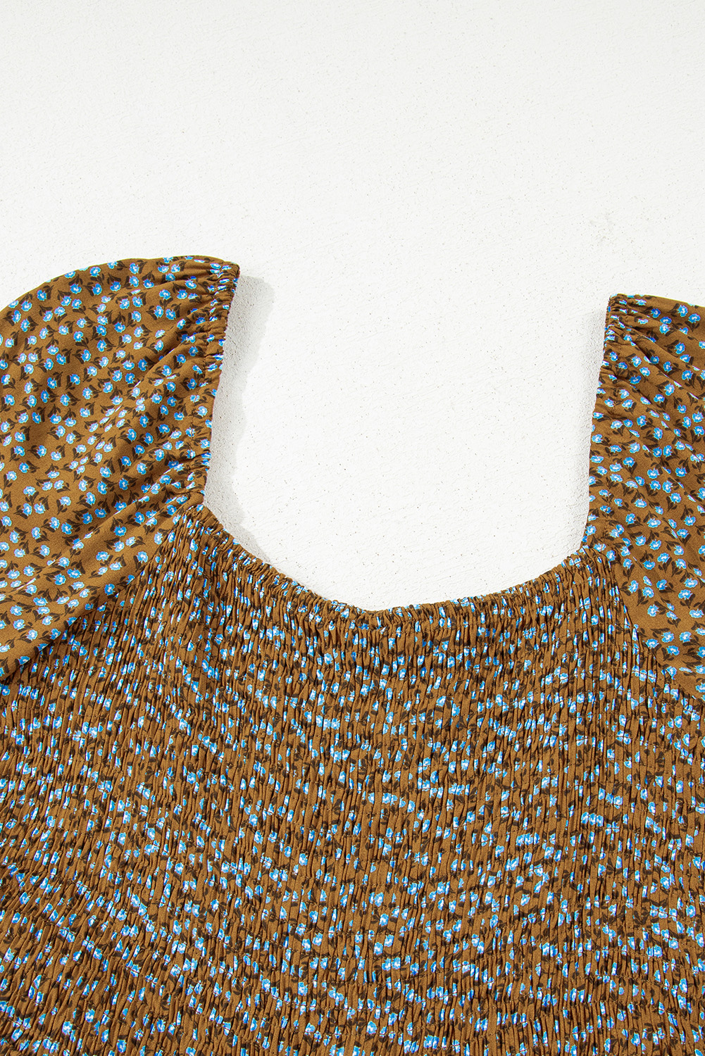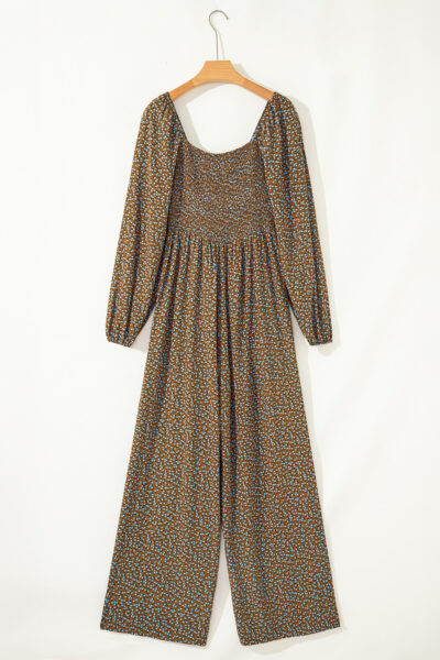 Brown Floral Print Western Smocked Bodice Square Neck Wide Leg Jumpsuit