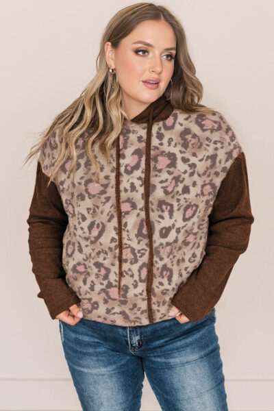 Brown Leopard Print Knit Patchwork Plus Hoodie