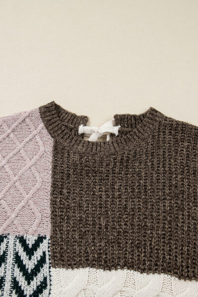 Brown Plus Size Color Block Patchwork Knotted Back Loose Fit Sweater