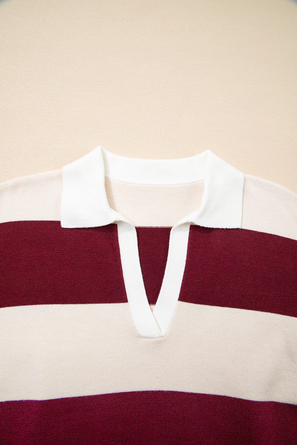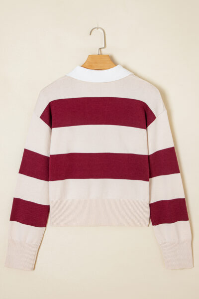 Brown Ribbed Trim Color Block Knitted Polo Collar Sweater
