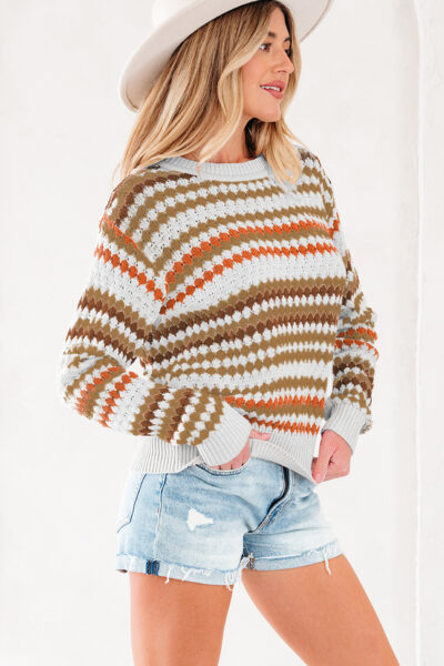 Brown Stripe Eyelet Patterned Drop Shoulder Sweater