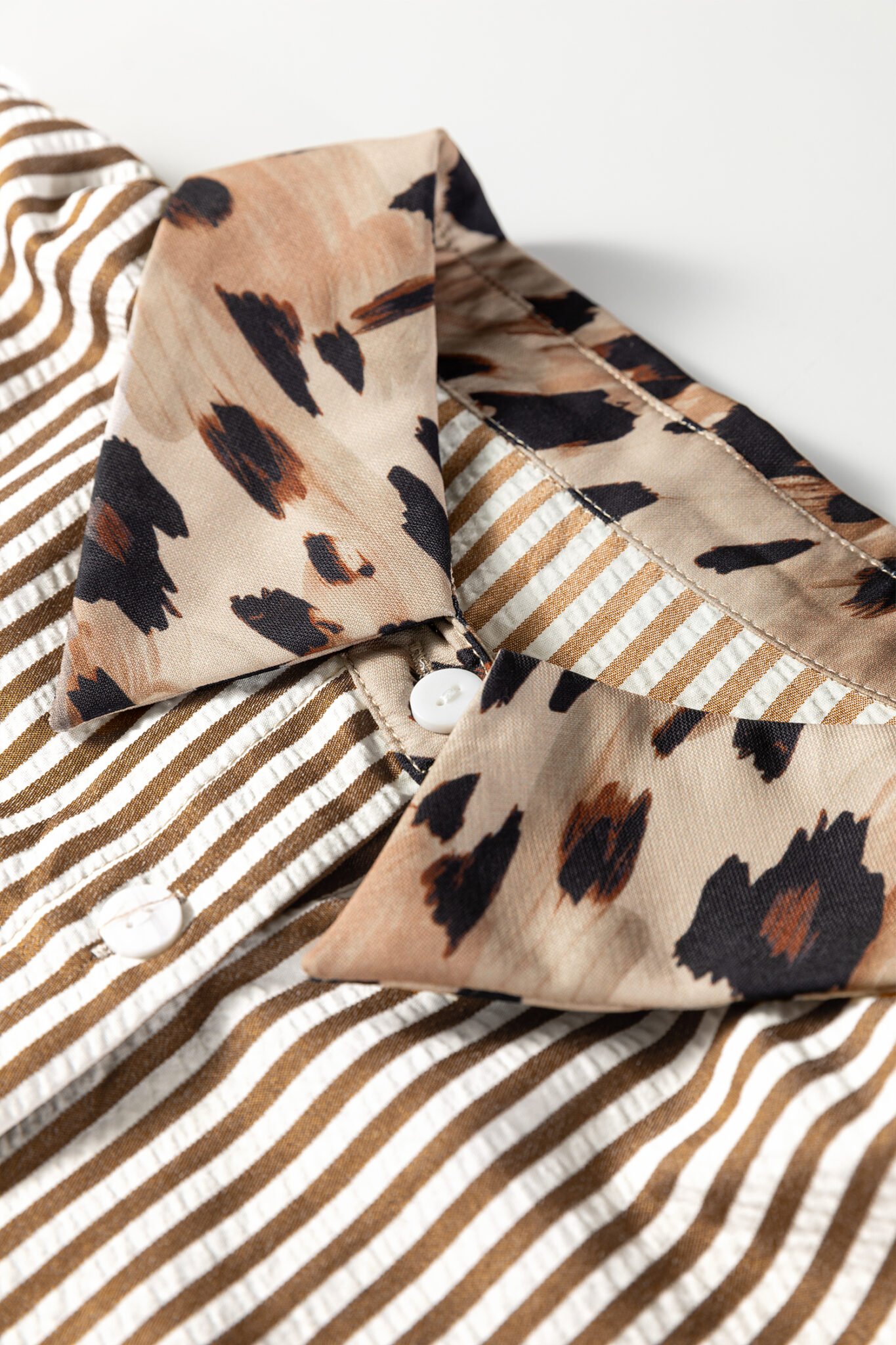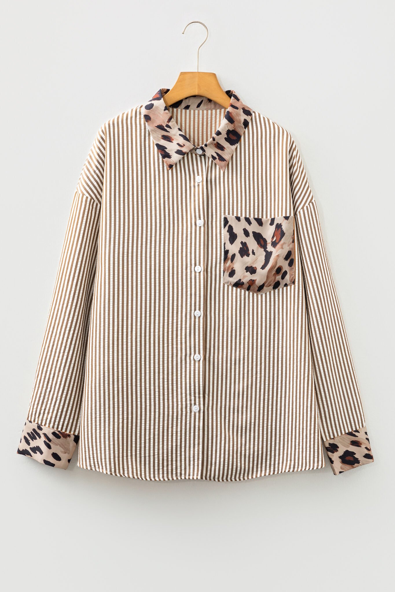Brown Stripe Leopard Patched Collared Chest Pocket Cuffed Long Sleeve Plus Size Shirt
