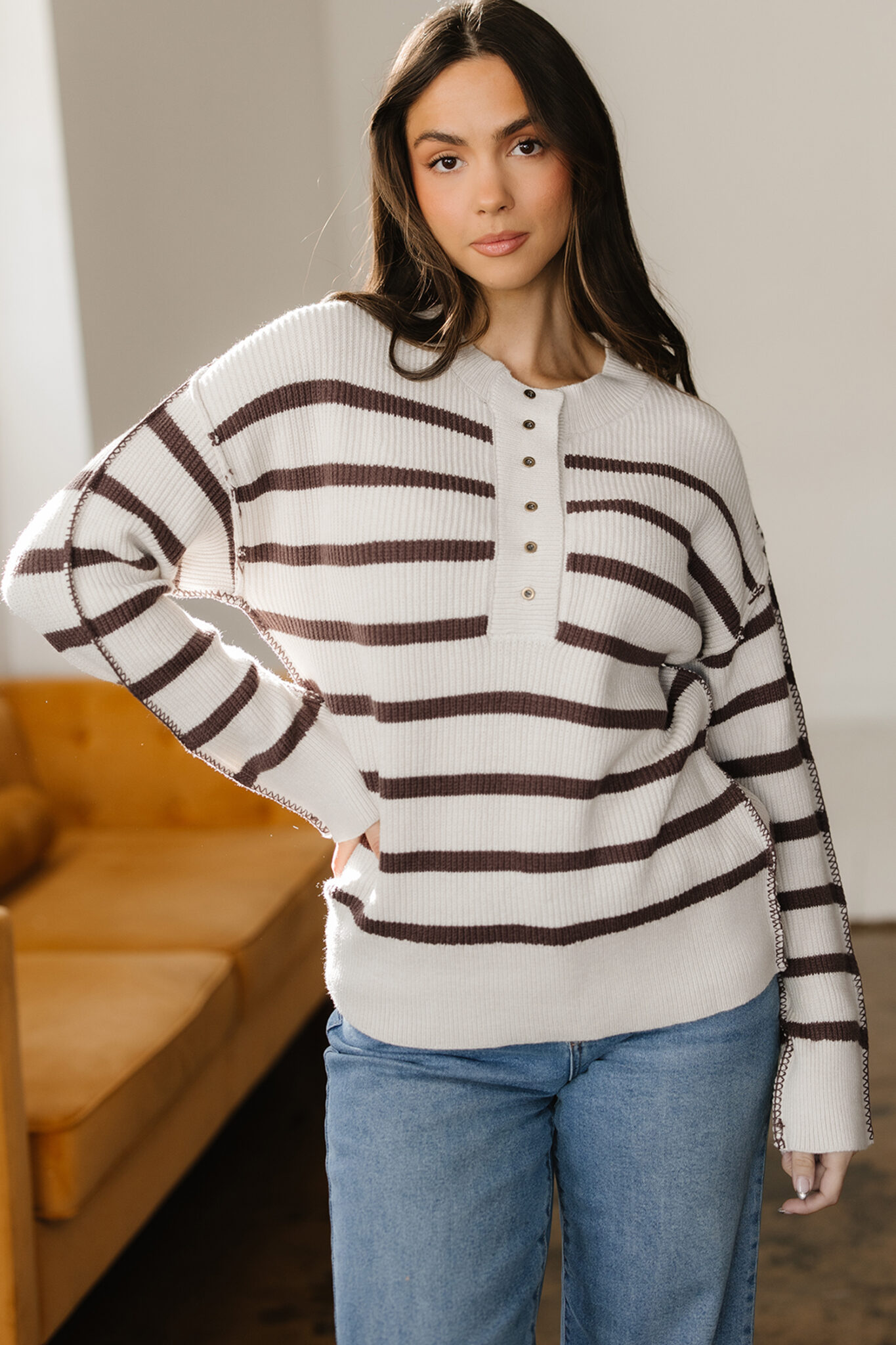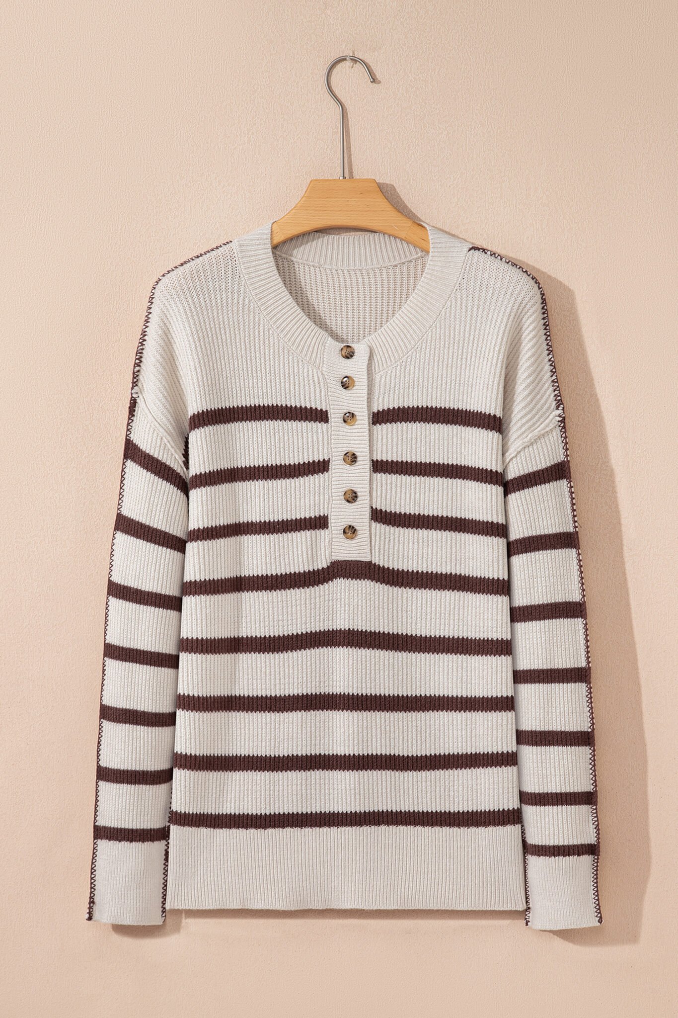 Brown Stripe Ribbed Henley Drop Shoulder Slouchy Sweater