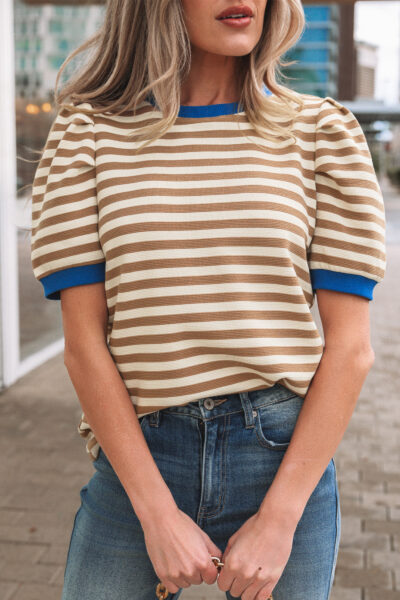 Brown Stripe Short Puff Sleeve Contrast Trim Round Neck Tee
