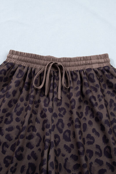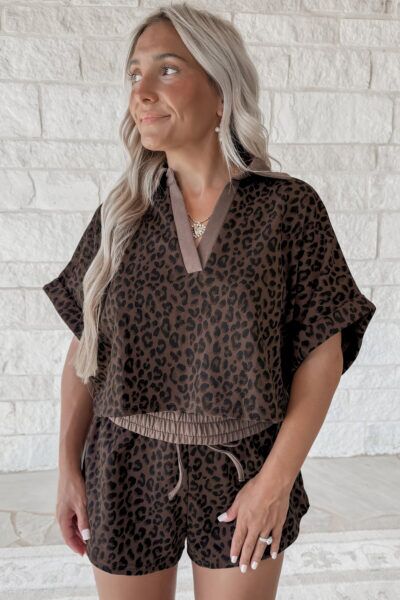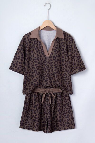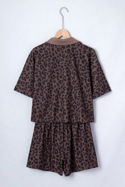 Brown V Neck Collar Leopard Printed 2pcs Short Set