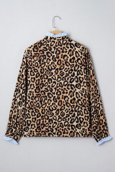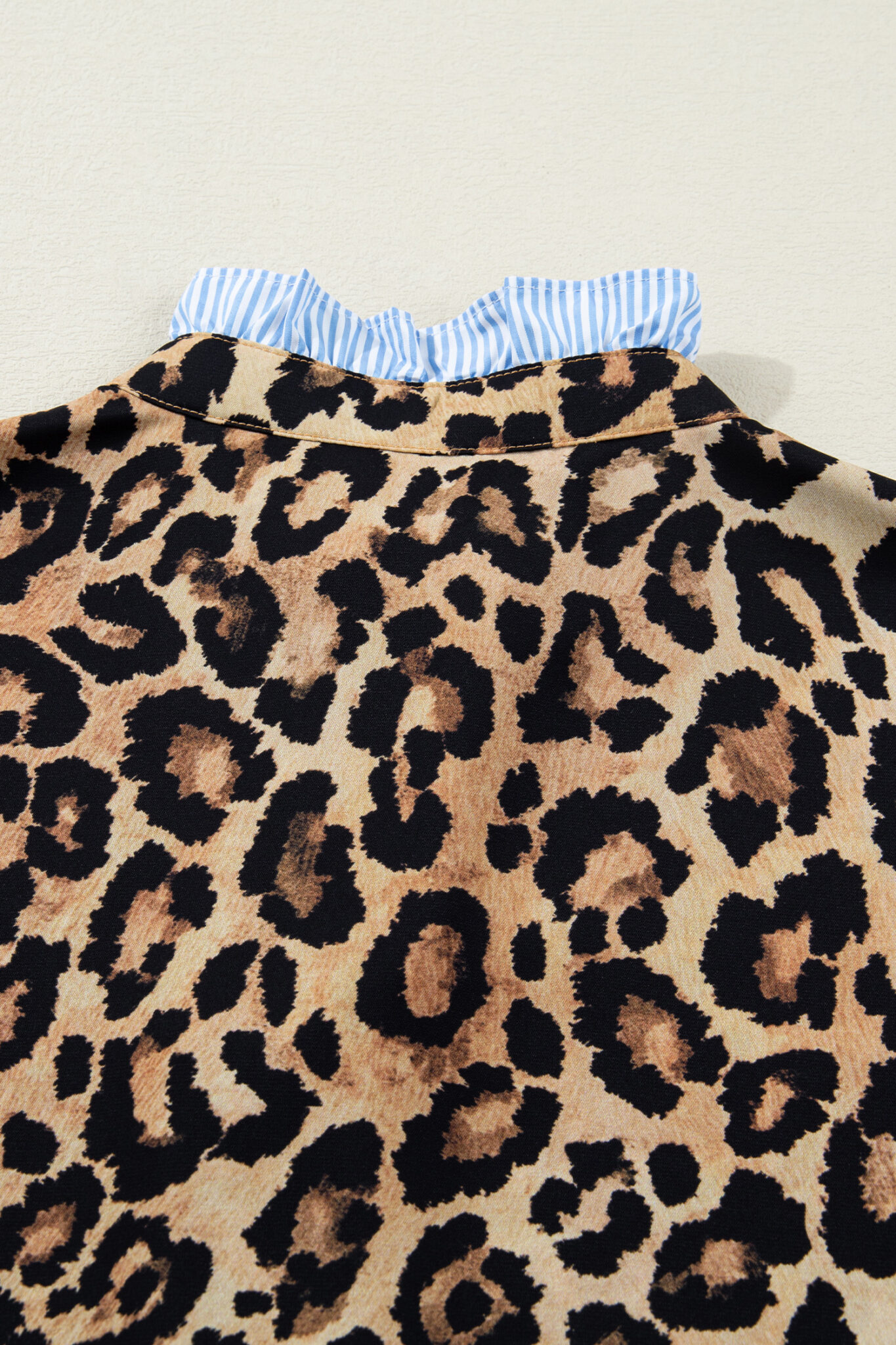 Brown Wild Leopard Print Contrast Striped Frilled Trim Chic Shirt