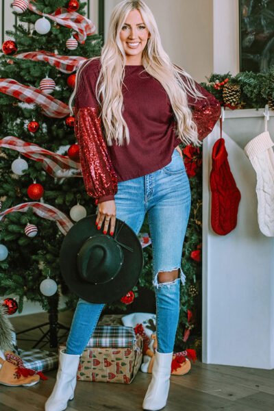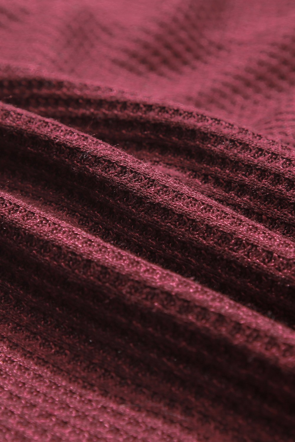 Burgundy Sequin Patchwork Sleeve Open Back Waffle Knit Top