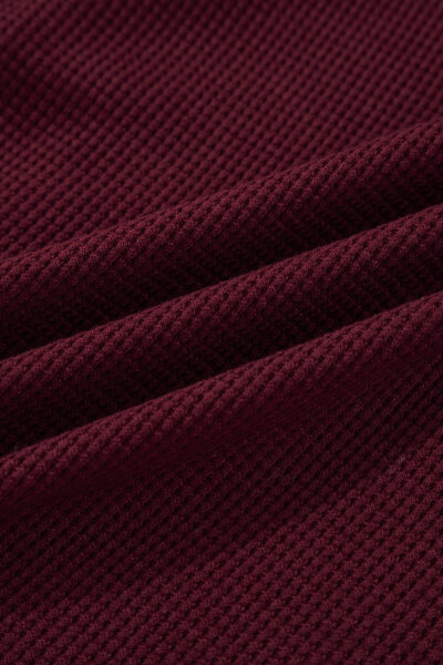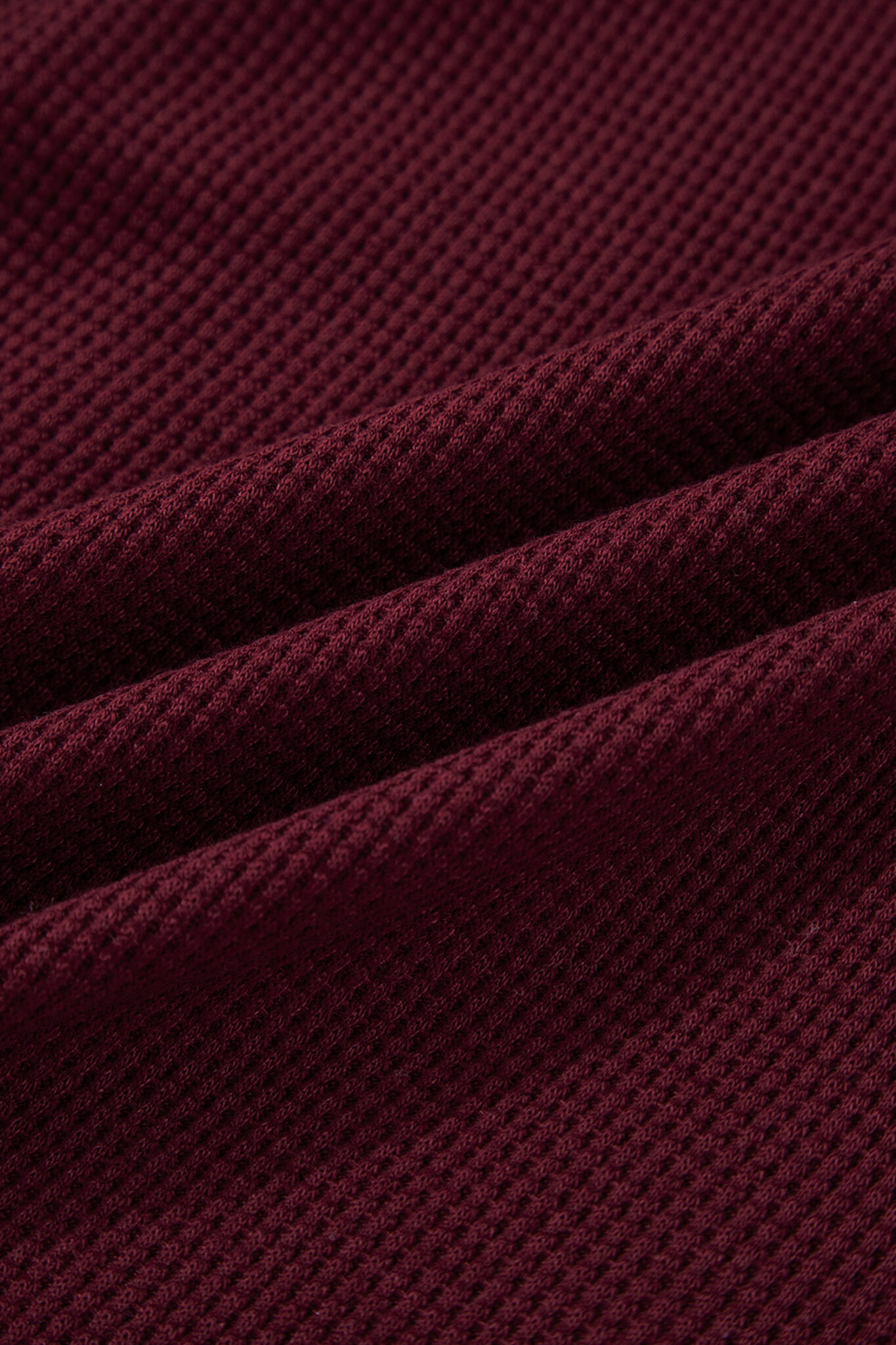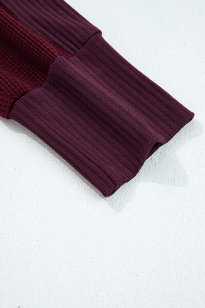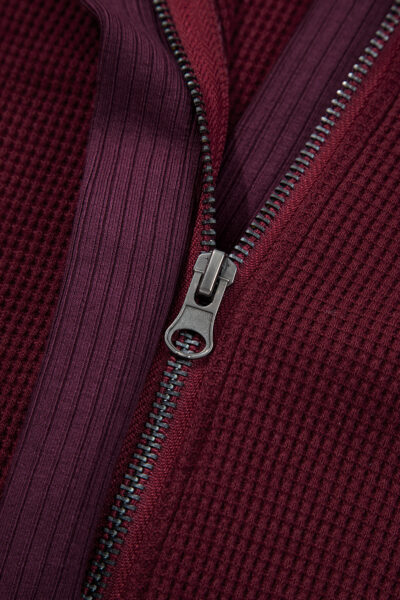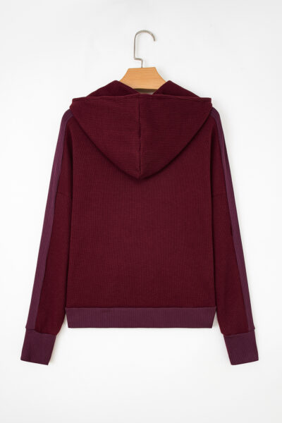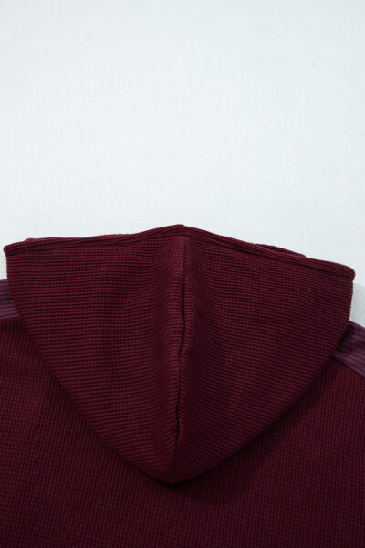 Burgundy Waffle Splicing Zip Up Front Button Hooded Jacket
