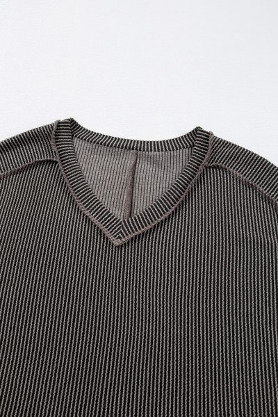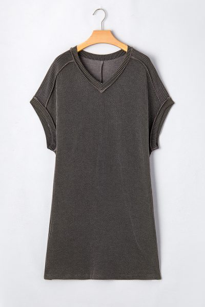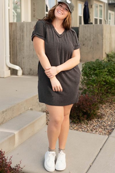Carbon Grey Corded V Neck Plus Size T Shirt Dress with Pockets