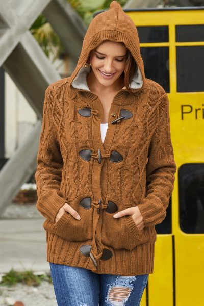 Carice Women’s Fur Hood Horn Button Sweater Cardigan Brown