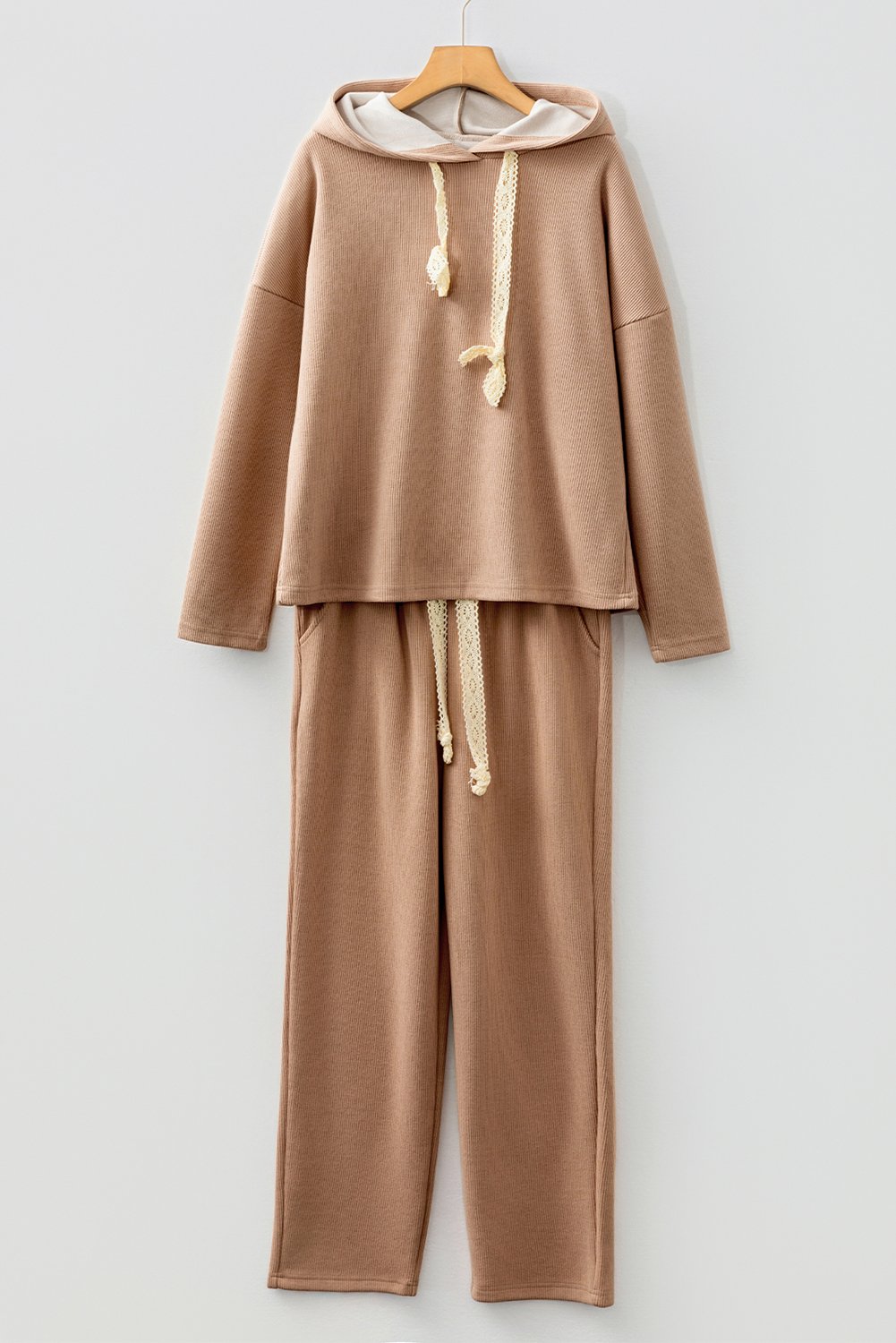 Casual Lace Drawstring Pullover Hoodie and High Waist Pants Corduroy Suit