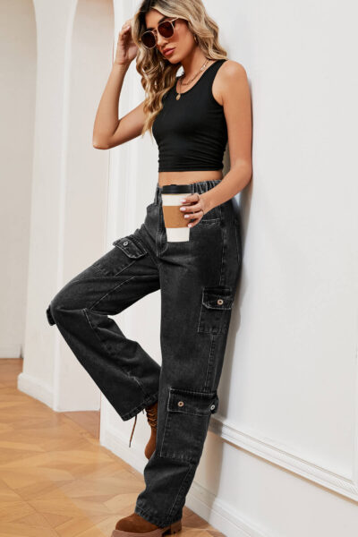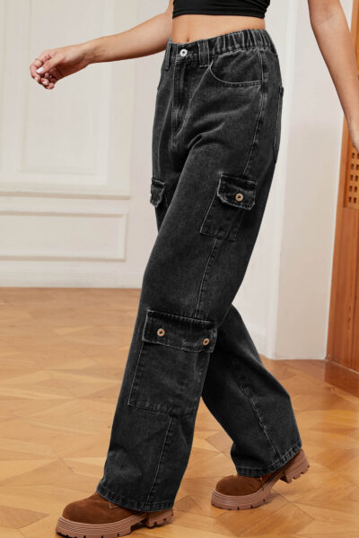 Charcoal Grey Asymmetric Pocket Denim Cargo Pants with Semi-Elastic Waist