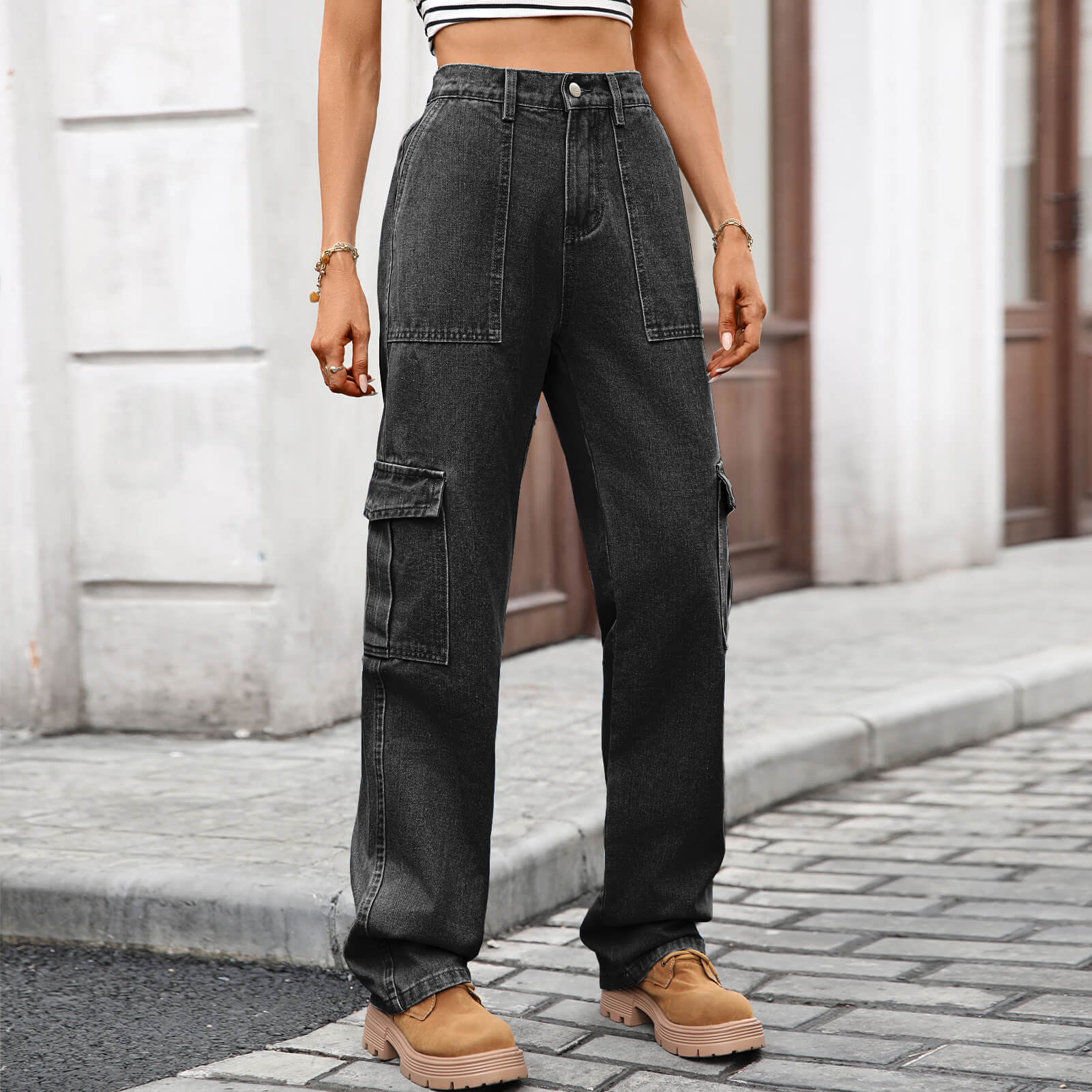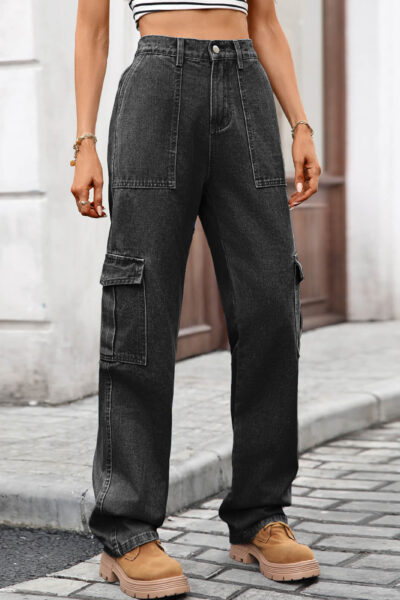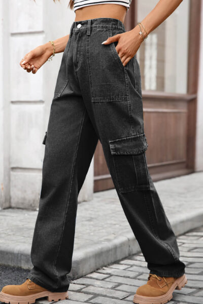 Charcoal Grey Washed Denim Cargo Pants with Large Pockets and Semi Elastic Waist