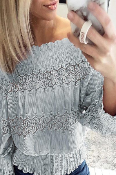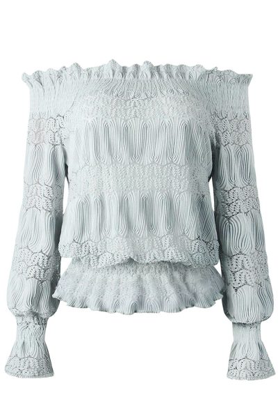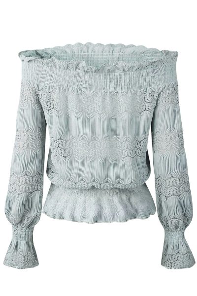Chelsea Women’s Stretchy Off Shoulder Ruffle Long Sleeve Smocked Waist Lace Crochet Blouse Tops Green