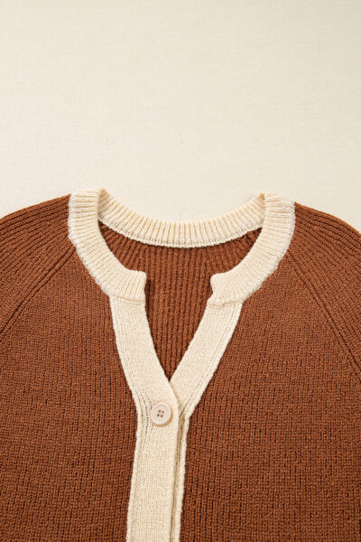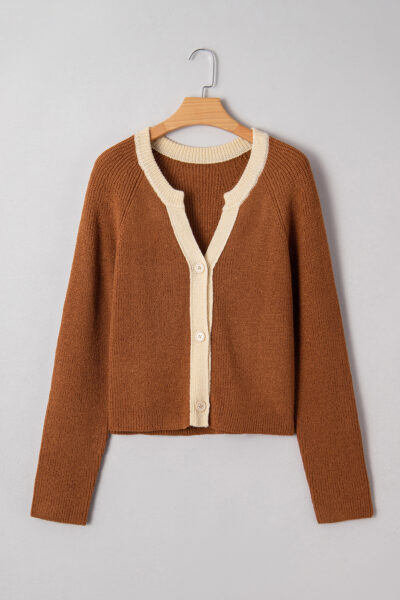 Chestnut Contrast Knit V Neckline Short Cardigan