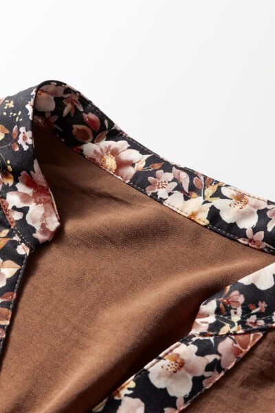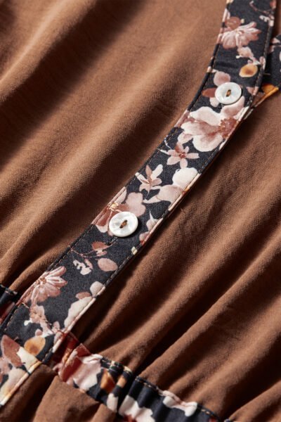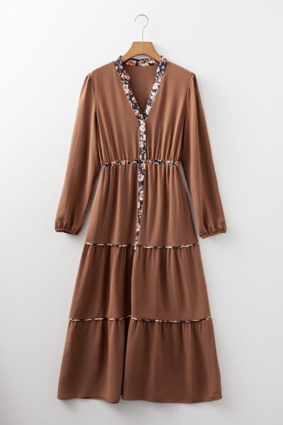 Chestnut Floral Patchwork Detail Notched Neck Long Sleeve Maxi Dress